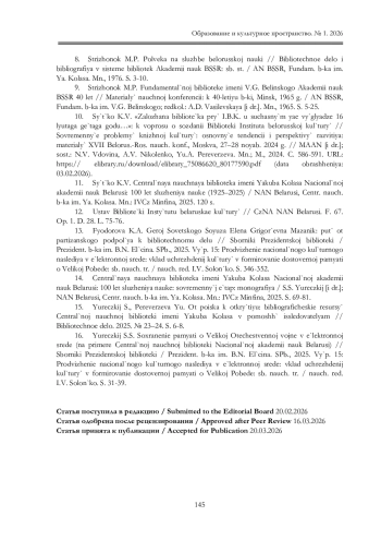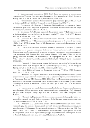 14. Центральная научная библиотека имени Якуба Коласа Национальной академии наук Беларуси: 100 лет служения науке: современный этап: монография / С.С. Юрецкий [и др.]; НАН Беларуси, Центр. науч. б-ка им. Я. Коласа. Мн.: ИВЦ Минфина, 2025. С. 69-81.