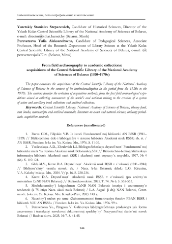 15. Юрецкий С., Переверзева Ю. От поиска к открытию: библиографические ре сурсы Центральной научной библиотеки имени Якуба Коласа в помощь исследователям // Библиотечное дело. 2025. № 23-24. С. 6-8.