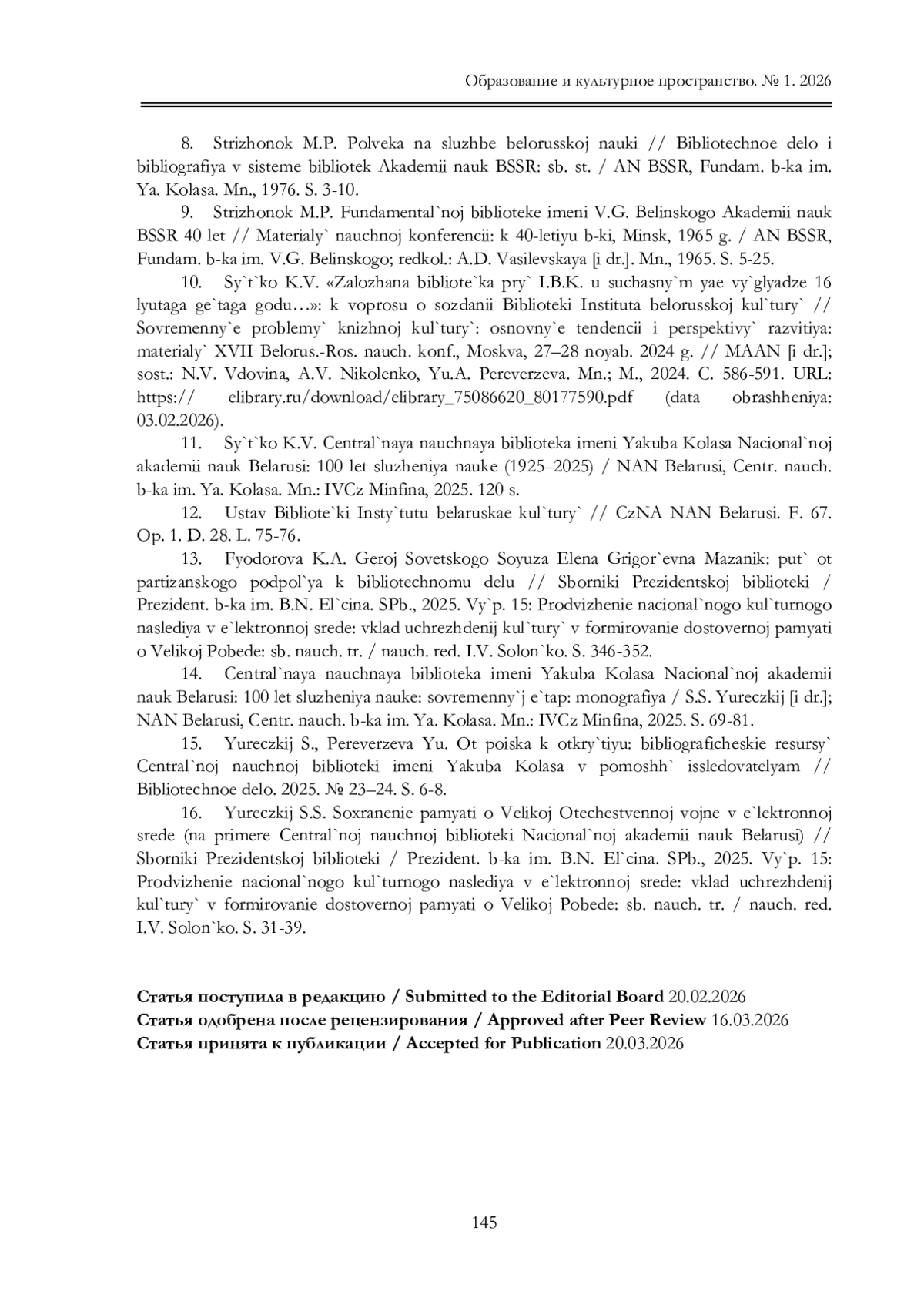 16. Юрецкий С.С. Сохранение памяти о Великой Отечественной войне в элек тронной среде (на примере Центральной научной библиотеки Национальной академии наук Беларуси) // Сборники Президентской библиотеки / Президент. б-ка им. Б.Н. Ель цина. СПб., 2025. Вып. 15: Продвижение национального культурного наследия в электронной среде: вклад учреждений культуры в формирование достоверной памяти о Великой Победе: сб. науч. тр. / науч. ред. И.В. Солонько. С. 31-39.