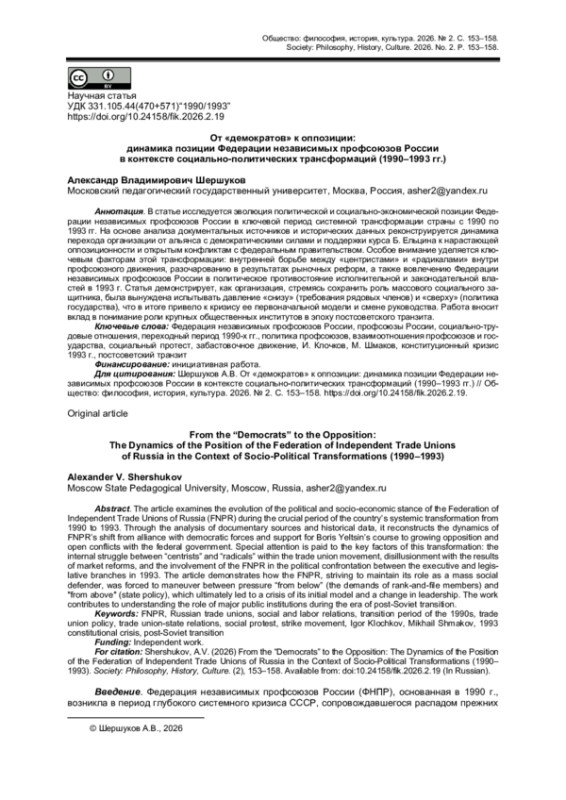 В статье исследуется эволюция политической и социально-экономической позиции Федерации независимых профсоюзов России в ключевой период системной трансформации страны с 1990 по 1993 гг. На основе анализа документальных источников и исторических данных реконструируется динамика перехода организации от альянса с демократическими силами и поддержки курса Б. Ельцина к нарастающей оппозиционности и открытым конфликтам с федеральным правительством. Особое внимание уделяется ключевым факторам этой трансформации: внутренней борьбе между «центристами» и «радикалами» внутри профсоюзного движения, разочарованию в результатах рыночных реформ, а также вовлечению Федерации независимых профсоюзов России в политическое противостояние исполнительной и законодательной властей в 1993 г. Статья демонстрирует, как организация, стремясь сохранить роль массового социального защитника, была вынуждена испытывать давление «снизу» (требования рядовых членов) и «сверху» (политика государства), что в итоге привело к кризису ее первоначальной модели и смене руководства. Работа вносит вклад в понимание роли крупных общественных институтов в эпоху постсоветского транзита.