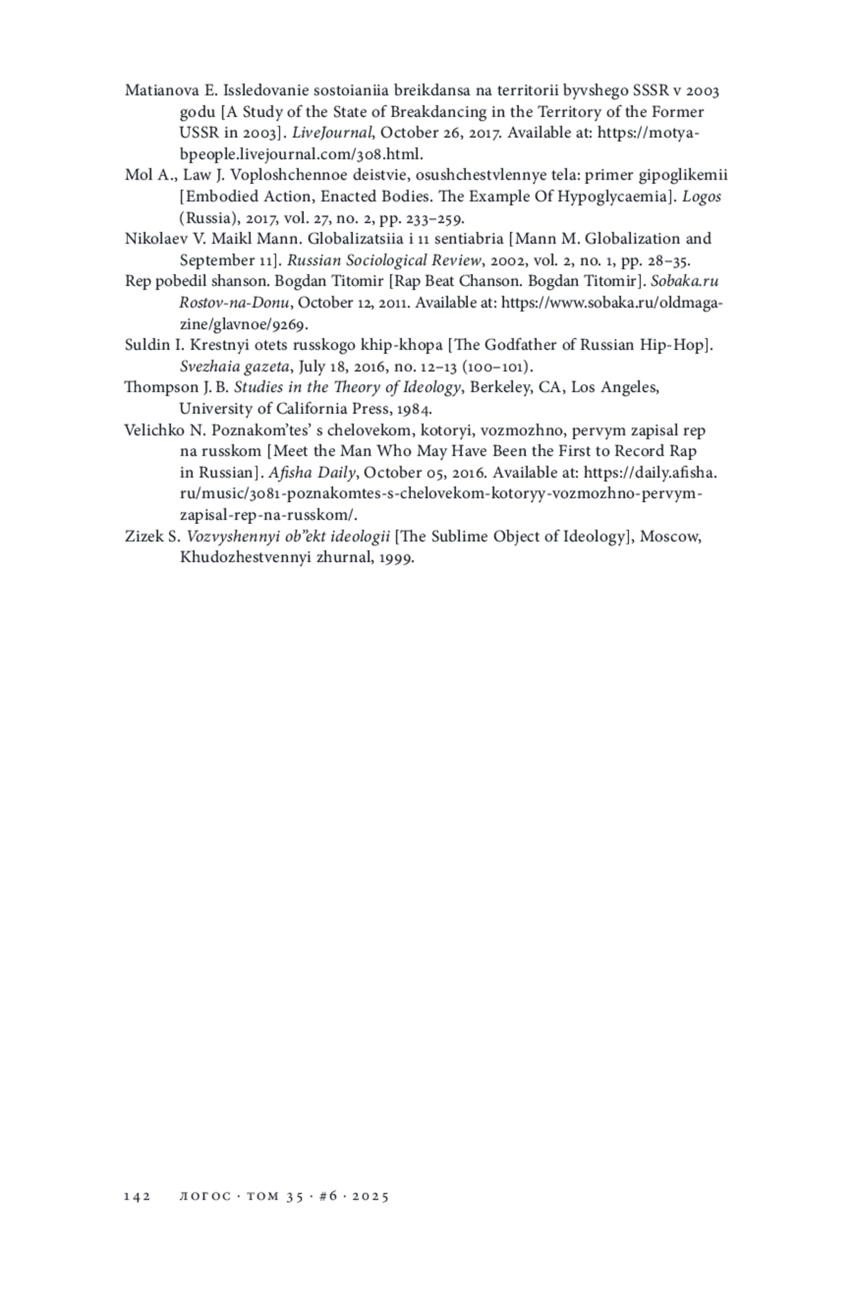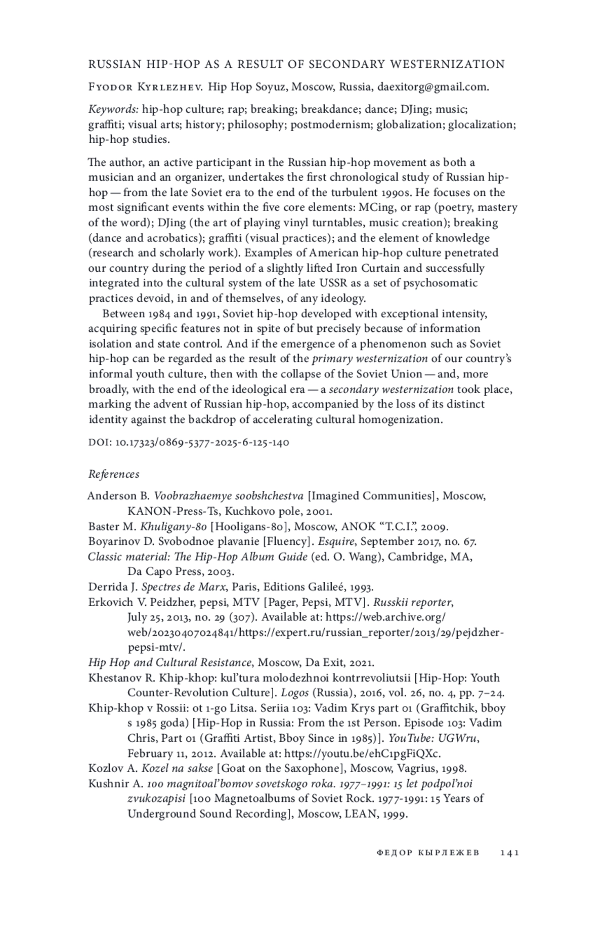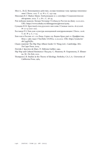 13. Хестанов Р. З. Хип-хоп: культура молодежной контрреволюции // Логос. 2016. Т. 26. № 4. С. 7-24. EDN: XAHIHT