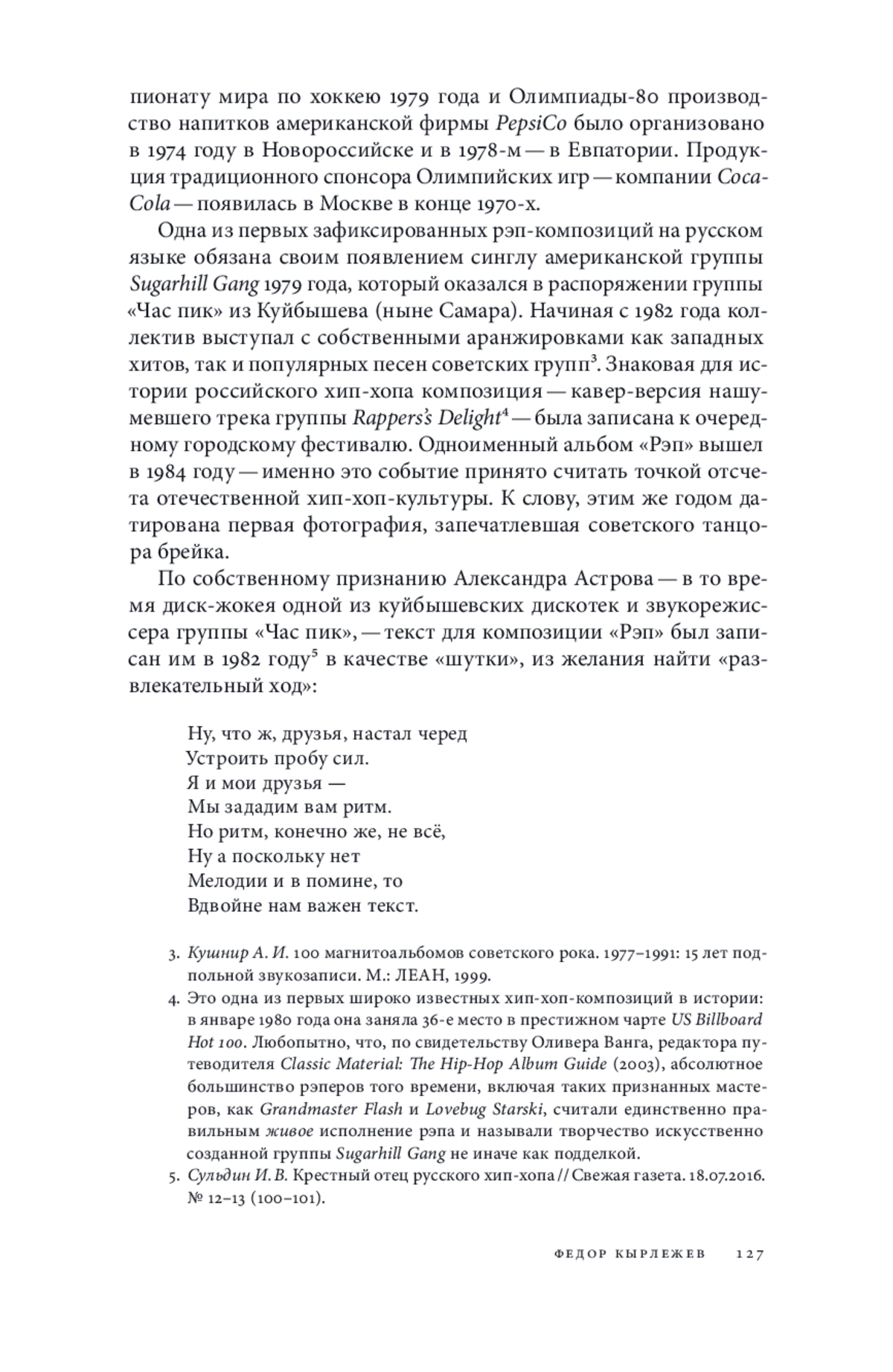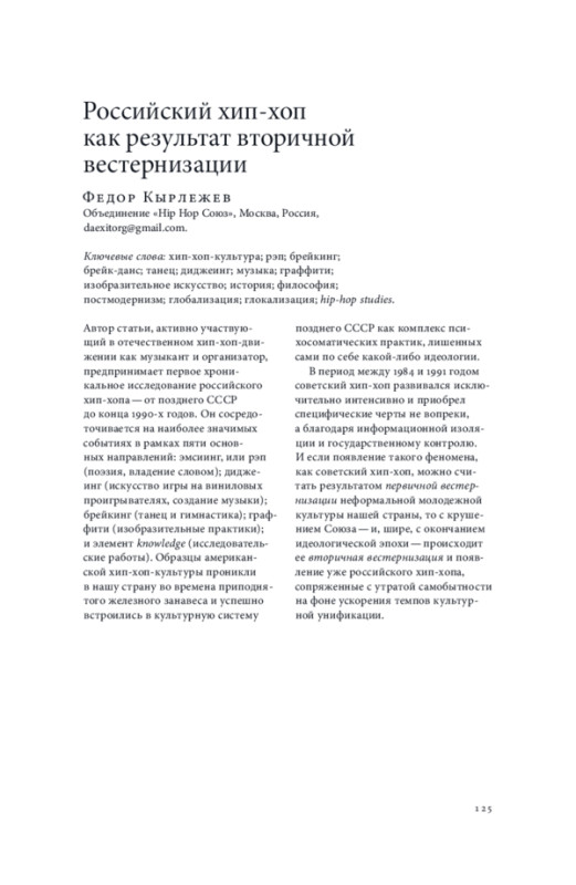 Автор статьи, активно участвующий в отечественном хип-хоп-движении как музыкант и организатор, предпринимает первое хроникальное исследование российского хип-хопа — от позднего СССР до конца 1990-х годов. Он сосредоточивается на наиболее значимых событиях в рамках пяти основных направлений: эмсиинг, или рэп (поэзия, владение словом); диджеинг (искусство игры на виниловых проигрывателях, создание музыки); брейкинг (танец и гимнастика); граффити (изобразительные практики); и элемент knowledge (исследовательские работы). Образцы американской хип-хоп-культуры проникли в нашу страну во времена приподнятого железного занавеса и успешно встроились в культурную систему позднего СССР как комплекс психосоматических практик, лишенных сами по себе какой-либо идеологии. В период между 1984 и 1991 годом советский хип-хоп развивался исключительно интенсивно и приобрел специфические черты не вопреки, а благодаря информационной изоляции и государственному контролю. И если появление такого феномена, как советский хип-хоп, можно считать результатом первичной вестернизации неформальной молодежной культуры нашей страны, то с крушением Союза — и, шире, с окончанием идеологической эпохи — происходит ее вторичная вестернизация и появление уже российского хип-хопа, сопряженные с утратой самобытности на фоне ускорения темпов культурной унификации
