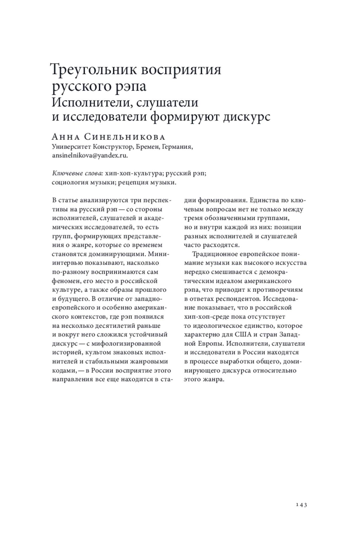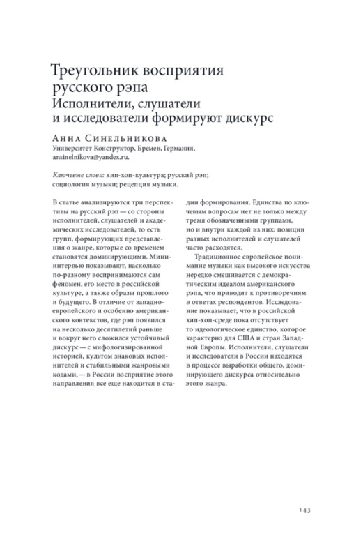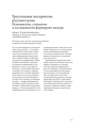 В статье анализируются три перспективы на русский рэп — со стороны исполнителей, слушателей и академических исследователей, то есть групп, формирующих представления о жанре, которые со временем становятся доминирующими. Миниинтервью показывают, насколько по-разному воспринимаются сам феномен, его место в российской культуре, а также образы прошлого и будущего. В отличие от западноевропейского и особенно американского контекстов, где рэп появился на несколько десятилетий раньше и вокруг него сложился устойчивый дискурс — с мифологизированной историей, культом знаковых исполнителей и стабильными жанровыми кодами, — в России восприятие этого направления все еще находится в стадии формирования. Единства по ключевым вопросам нет не только между тремя обозначенными группами, но и внутри каждой из них: позиции разных исполнителей и слушателей часто расходятся. Традиционное европейское понимание музыки как высокого искусства нередко смешивается с демократическим идеалом американского рэпа, что приводит к противоречиям в ответах респондентов. Исследование показывает, что в российской хип-хоп-среде пока отсутствует то идеологическое единство, которое характерно для США и стран Западной Европы. Исполнители, слушатели и исследователи в России находятся в процессе выработки общего, доминирующего дискурса относительно этого жанра