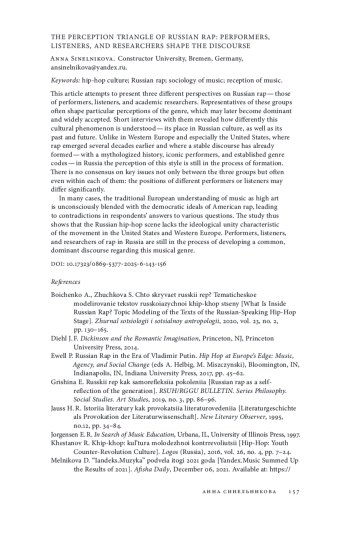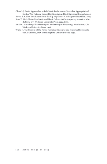 1. Бойченко А. Е., Жучкова С. В. Что скрывает русский рэп? Тематическое моделирование текстов русскоязычной хип-хоп сцены // Журнал социологии и социальной антропологии. 2020. Т. 23. № 2. С. 130-165. EDN: RQYPZA