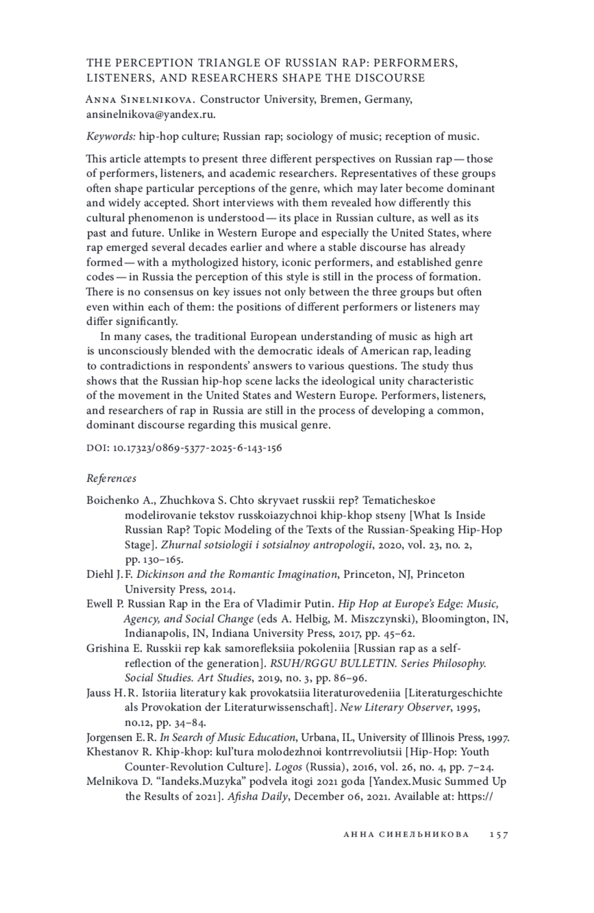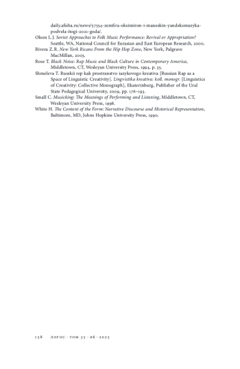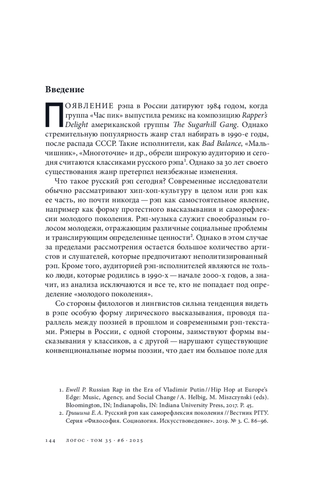 7. Ewell P.Russian Rap in the Era of Vladimir Putin // Hip Hop at Europe’s Edge: Music, Agency, and Social Change / A. Helbig, M. Miszczynski (eds). Bloomington, IN; Indianapolis, IN: Indiana University Press, 2017. P. 45-62.