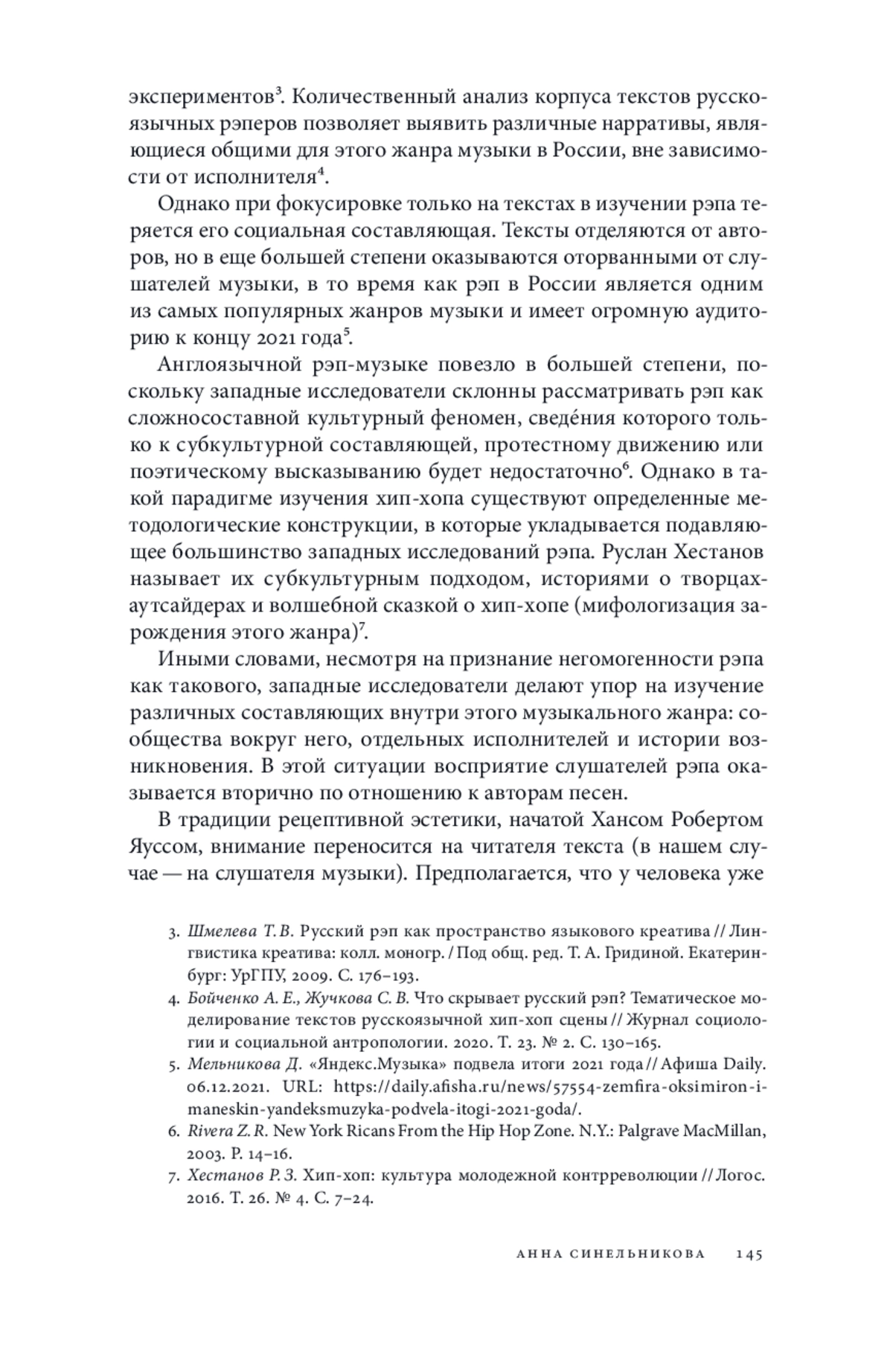 2. Гришина Е. А. Русский рэп как саморефлексия поколения // Вестник РГГУ. Серия “Философия. Социология. Искусствоведение”. 2019. № 3. С. 86-96. Мельникова Д. “Яндекс.Музыка” подвела итоги 2021 года // Афиша Daily. 06.12.2021. URL: https://daily.afisha.ru/news/57554-zemfira-oksimiron-imaneskin-yandeksmuzyka-podvela-itogi-2021-goda/.