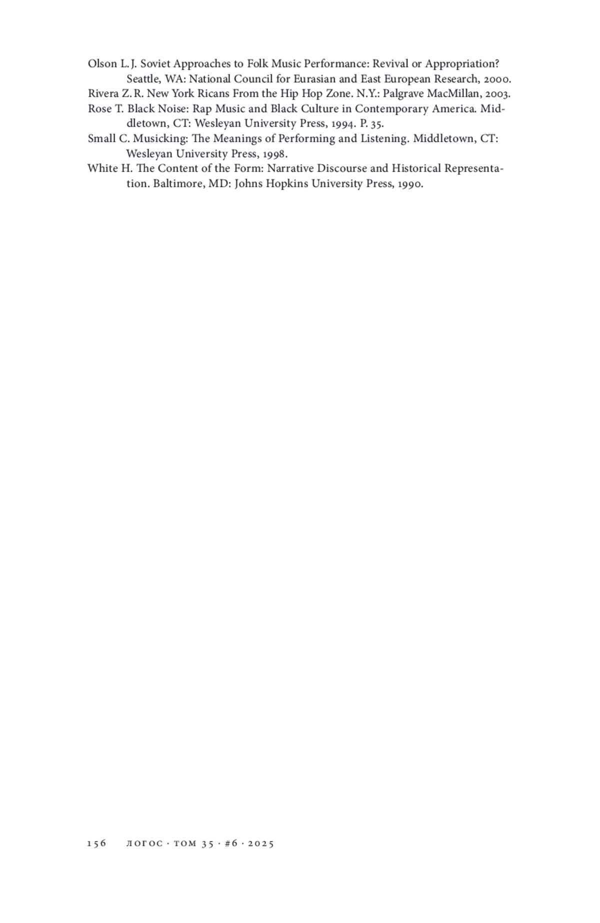 3. Хестанов Р. З. Хип-хоп: культура молодежной контрреволюции // Логос. 2016. Т. 26. № 4. С. 7-24. EDN: XAHIHT