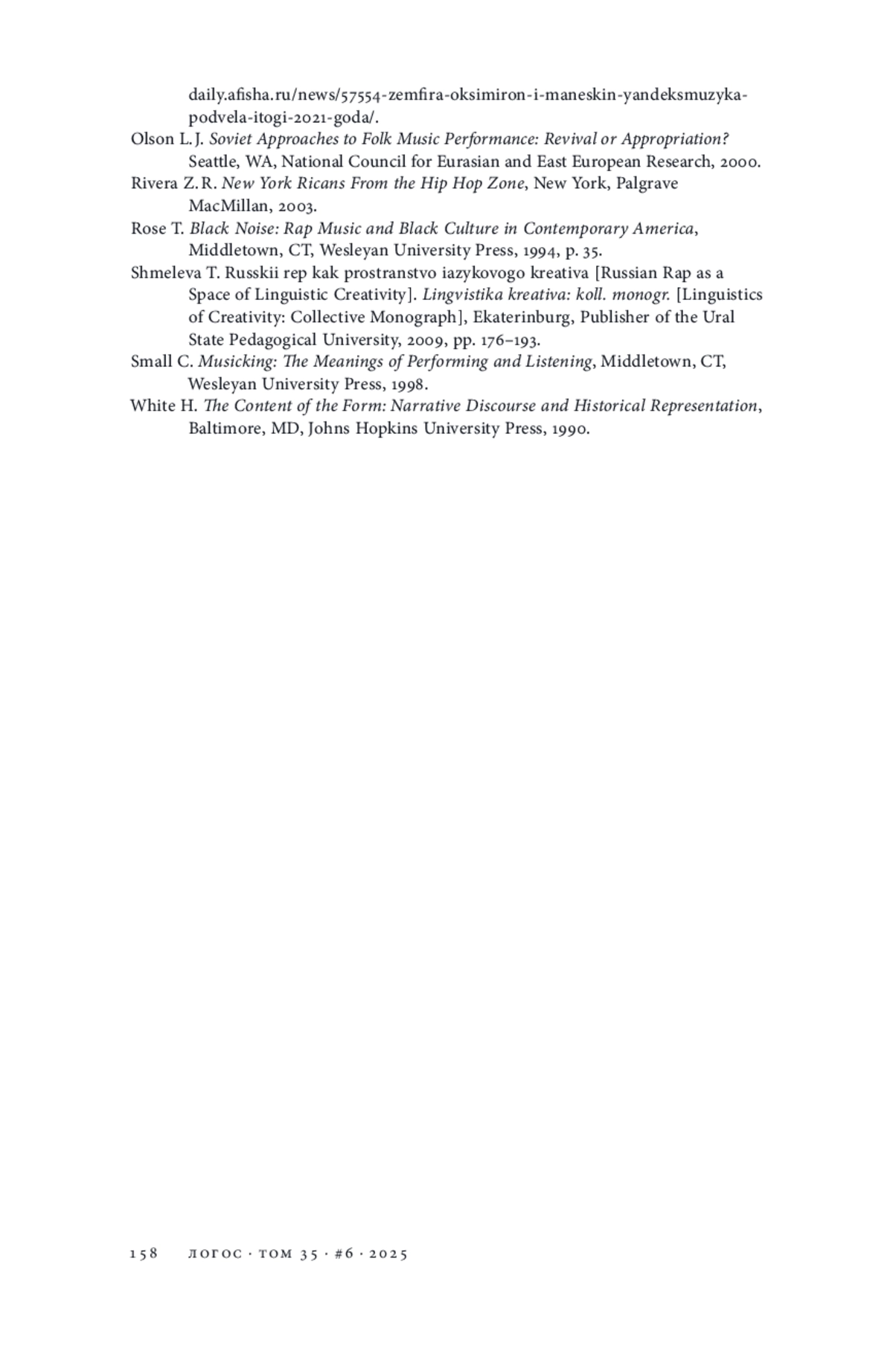 4. Шмелева Т. В. Русский рэп как пространство языкового креатива // Лингвистика креатива: колл. моногр. / Под общ. ред. Т. А. Гридиной. Екатеринбург: УрГПУ, 2009. С. 176-193.