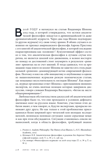 В 2018 году я наткнулся на статью Владимира Шохина 2013 года, в которой утверждалось, что истоки аналитической философии зиждутся в древнеиндийской (и даже древнекитайской) мудрости. Через два года Шохин подтвердил (в другом журнале) эту свою точку зрения. В обоих случаях в союзники он призвал американского философа Аарона Престона с его книгой об аналитической философии, в которой последняя охарактеризована как «иллюзия»1. Кумулятивный эффект состоял в том, что аналитическая философия в лучшем случае вторична, не является школой или движением, и всякие восторги по поводу ее достижений стоит поумерить в результате «ревизии» принятых на ее счет мнений. Я тогда удивился, что за прошедшие годы никто из коллег Шохина не заметил его столь радикальной «ревизии» доминирующей ветви современной философии. Поэтому я взял на себя инициативу и опубликовал в одном из вышеозначенных журналов резкую полемическую статью, где показывал несостоятельность взглядов Шохина2. Как водится, журнал организовал ответ Шохина с приглашением внешних экспертов, не очень внятная позиция которых завершила дискуссию, говоря словами Владимира Высоцкого, «бегом на месте общепримиряющим»