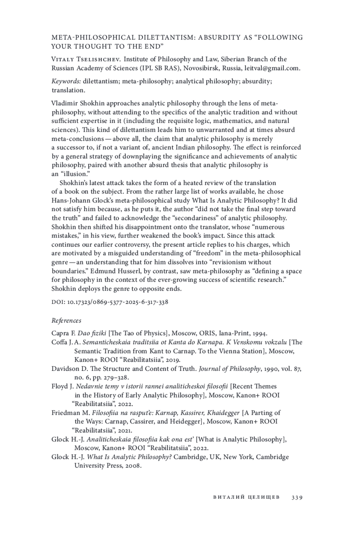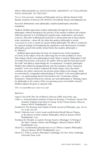 21. Шохин В. В. Аналитическая философия: удалось ли наконец ее определить? // Логос. 2024. Т. 34. № 6. С. 297-320. EDN: SBDQRP