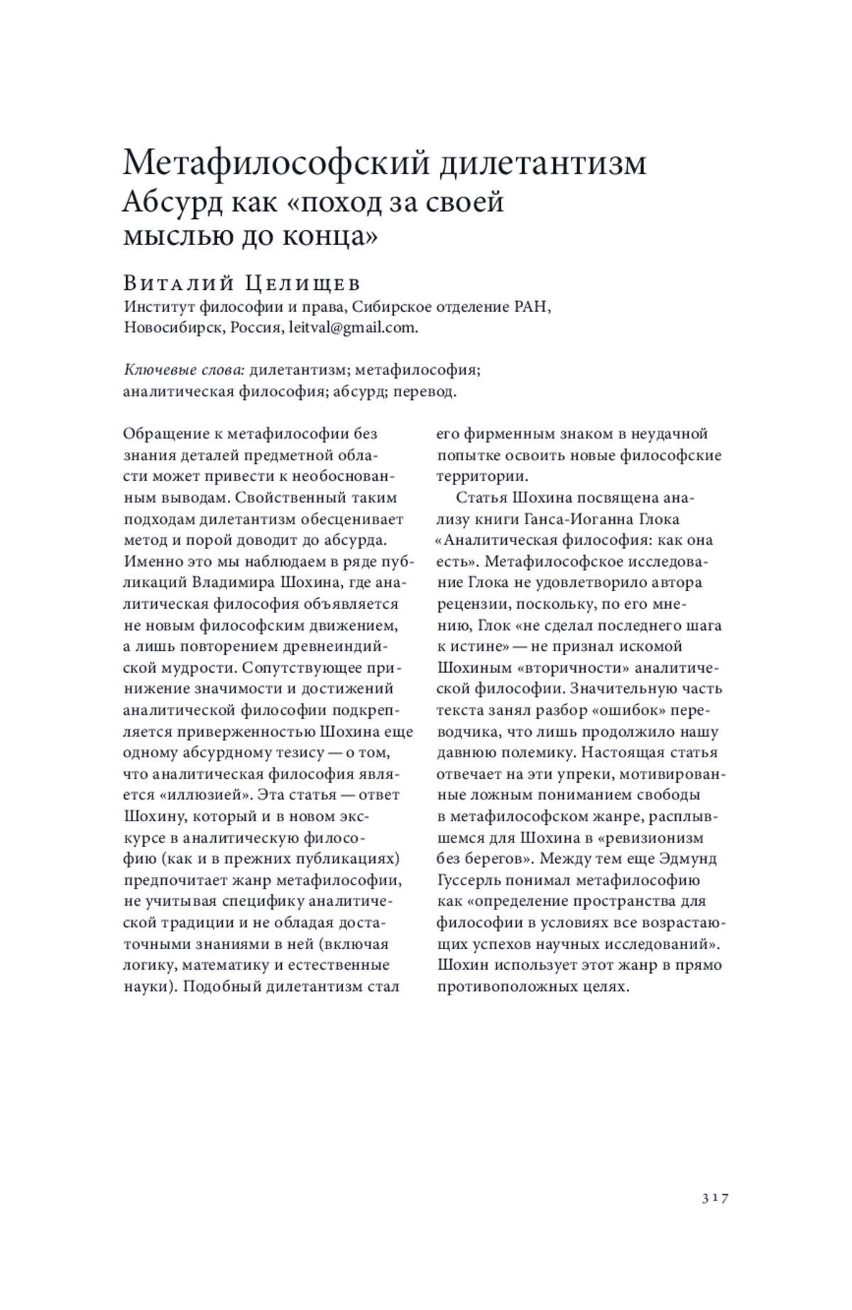 20. Целищев В. В. Аналитическая философия и реализм без берегов // Философский журнал. 2018. Т. 11. № 2. С. 138-155. EDN: XRDBET