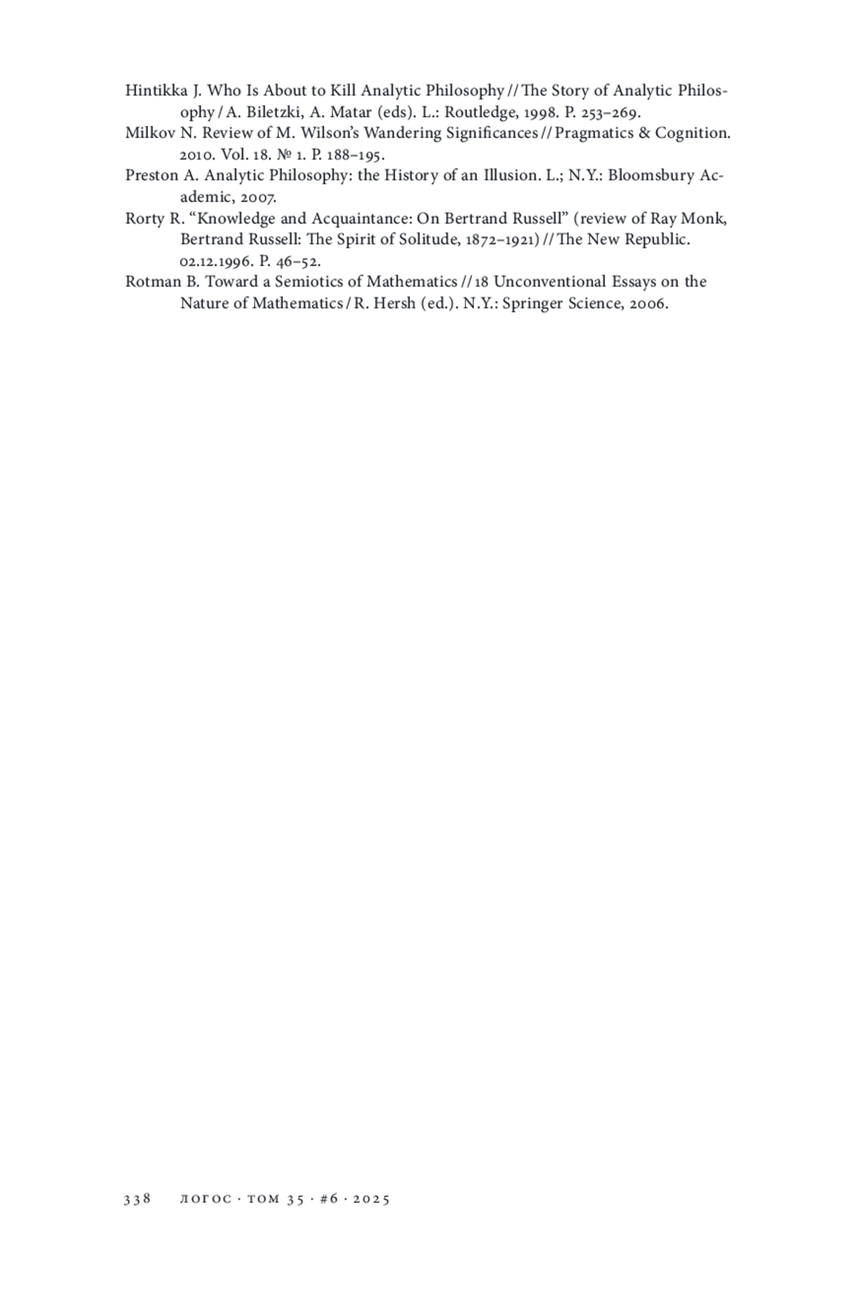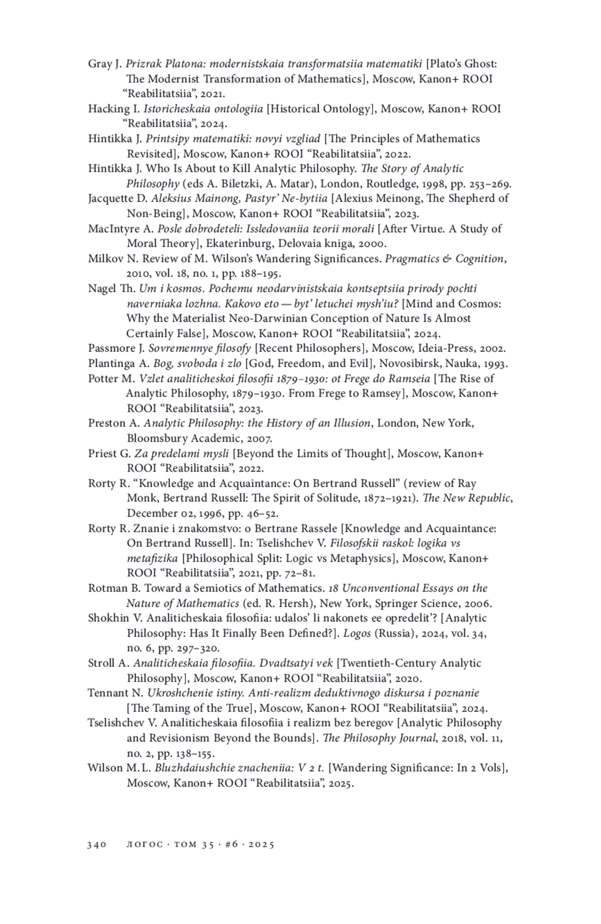 12. Рорти Р. Знание и знакомство: о Бертране Расселе // Целищев В. В. Философский раскол: логика vs метафизика. М.: Канон+ РООИ “Реабилитация”, 2021. С. 72-81.