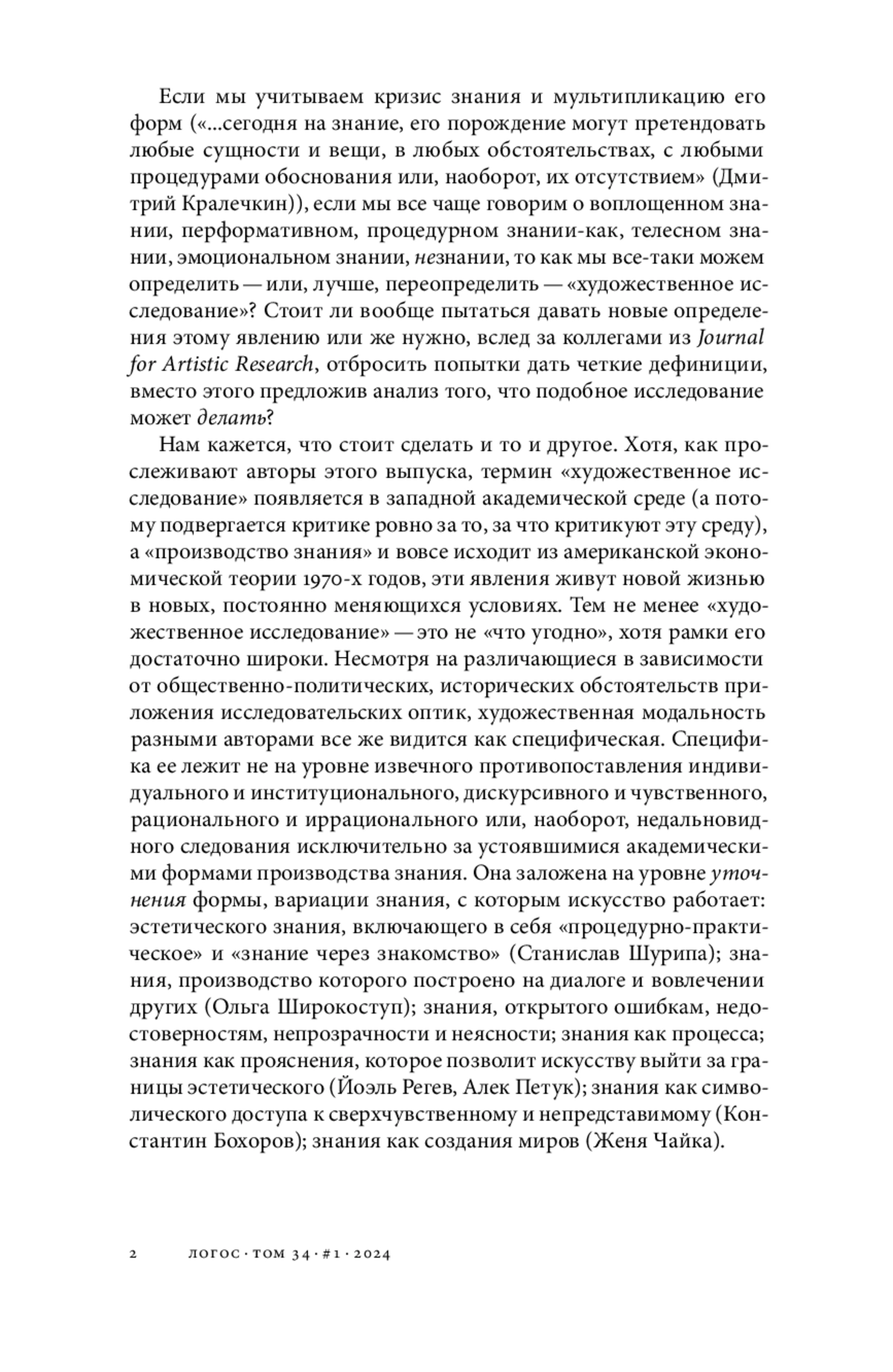 В статье рассматривается специфика российского искусства, которое можно определить как «художественное исследование». Для этого с помощью исторического анализа этого явления выводится сущностная характеристика художественного исследования как такового. Она заключается в переплетении онтологии, эпистемологии и методологии произведения или процесса, задаваемом через внеположную вопросам искусства проблематику. Искусство в этой ситуации выступает в качестве «эпистемической вещи» (Хенк Боргдорф), «теоретического объекта» (Юбер Дамиш) или энактивной среды. Эта пограничность, или взаимообусловленное переплетение предмета, метода и задачи произведения, по-разному проявляется в различных диспозитивах производства знания в искусстве, разнящихся от контекста к контексту, несмотря на глобализованную сцену искусства XXI века. Российское искусство конца 2000-х — начала 2010-х годов в массе своей только подступалось к использованию исследовательской парадигмы. Ее приложение обусловлено спектром причин, среди которых — необходимость выстраивать произведение искусства как комплексное размышление на социально острую тему, например национальной идентичности и исторической амнезии. Рассматриваемый сегмент искусства пытался избегать слипания с расхожей медийной образностью, отстраняясь и от господствующей риторики, и от иронического осмысления ее предшественниками и коллегами-современниками, обходя вместе с тем и активистские стратегии. Знание, с которым имело дело такое искусство, — это зачастую незнание, несхватываемое, стертое и закамуфлированное. Такое знание находило свое ускользающее от моментального схватывания воплощение, материализуясь в следах отсутствия, рассеянном авторстве, сбоях и прочих видах дистанцирования, но в них же порой обнаруживались и его коммуникативные ограничения