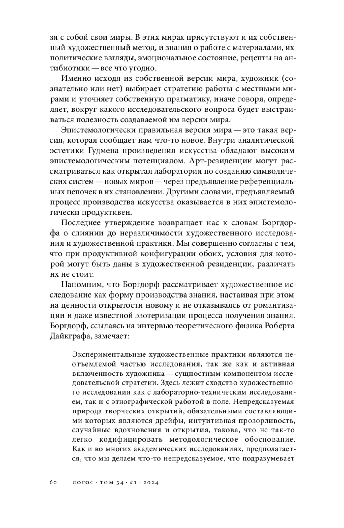 В статье художественные резиденции берутся как объект исследования. Рассматриваются стереотипы, связанные с ролью арт-резиденций в художественном процессе, например представление о сайт-специфичности и о художнике в резиденции как о человеке, обязательно наделенном свежей оптикой и призванном освоить место. В статье отмечается, что в мире резиденций разделяются режим работы на результат, или создание произведения, и режим исследования. В настоящее время наблюдается крен в сторону исследовательских резиденций. Далее в статье рассматривается специфика художественного исследования и его роль в художественном процессе. Упоминается подход Жан-Франсуа Лиотара к выставкам как к философским высказываниям и анализируется концепция Нельсона Гудмена о создании миров. Стратегии работы в резиденции описываются через конкретные способы создания миров, исследование в резиденции разбирается как возможность конструирования правильной, то есть эпистемологически продуктивной, версии мира. Через расширение некоторых положений аналитической эстетики Гудмена делается акцент на арт-резиденции как на уникальном, лабораторном, пространстве/условии/контексте создания новых символических систем — миров — посредством предъявления референциальных цепочек в их становлении и дешифровке. В ситуации художественных резиденций новые миры создаются буквально на наших глазах, и, взятые как предмет исследования, арт-резиденции предоставляют условия для разложения художественного процесса на его составляющие. Арт-резиденции — пространства, в которых разворачиваются и сворачиваются связи между мирами