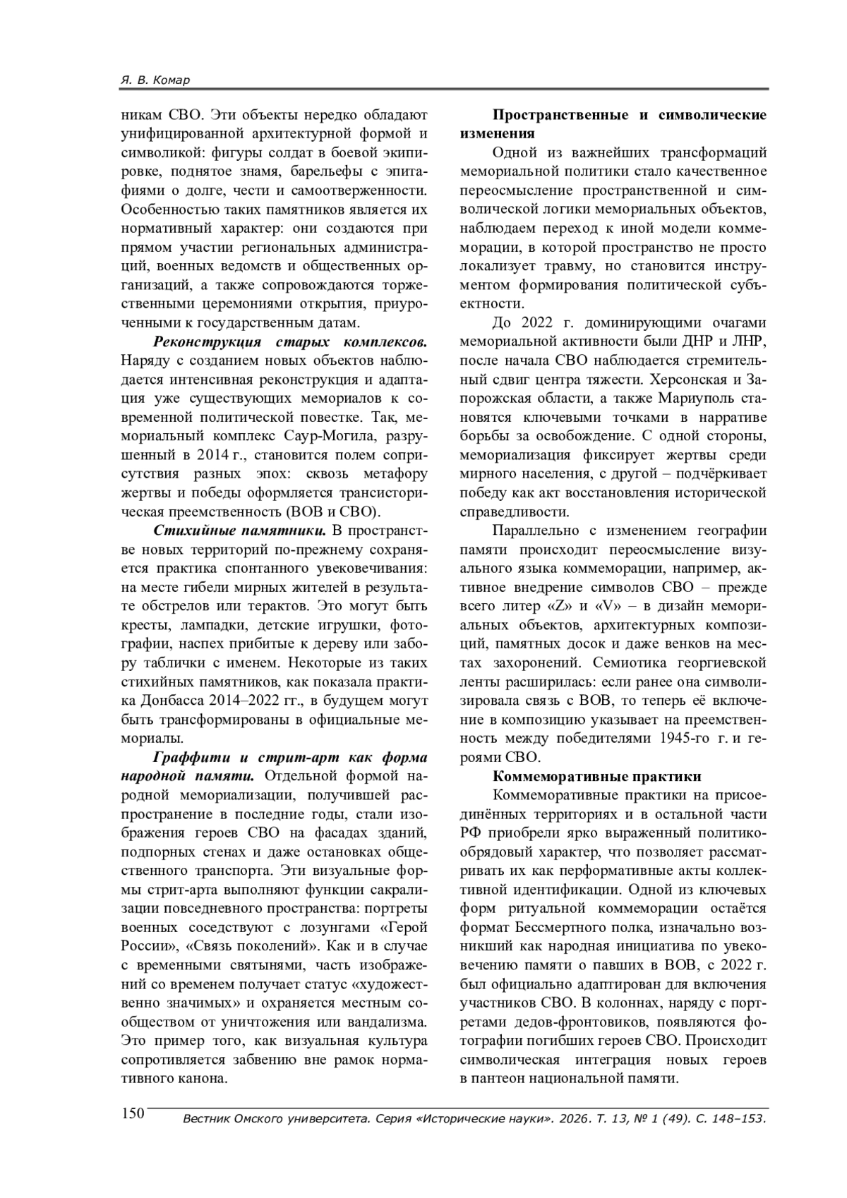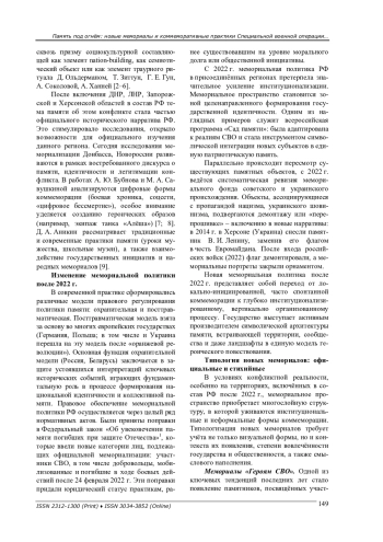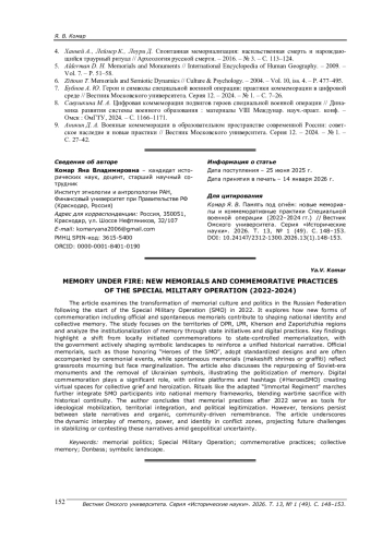 Исследуются изменения в мемориальной культуре и политике Российской Федерации после начала Специальной военной операции в 2022 г. Анализируются новые формы коммеморации, включая официальные и стихийные мемориалы, их роль в формировании национальной идентичности и коллективной памяти. Особое внимание уделено трансформации символического ландшафта на присоединённых территориях (ДНР, ЛНР, Херсонской и Запорожской областях), а также институционализации памяти через государственные инициативы и цифровые практики. Исследование основано на компаративном анализе мемориальных объектов и контент-анализе открытых источников.