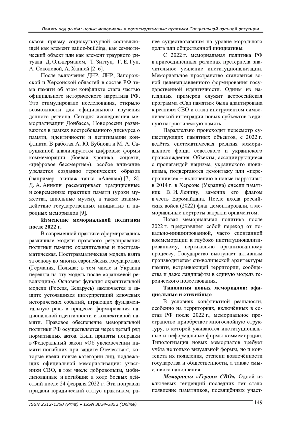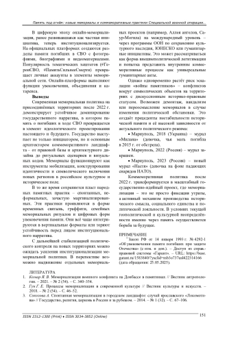 7. Бубнов А. Ю. Герои и символы специальной военной операции: практики коммеморации в цифровой среде // Вестник Московского университета. Серия 12. - 2024. - № 1. - С. 7-26.