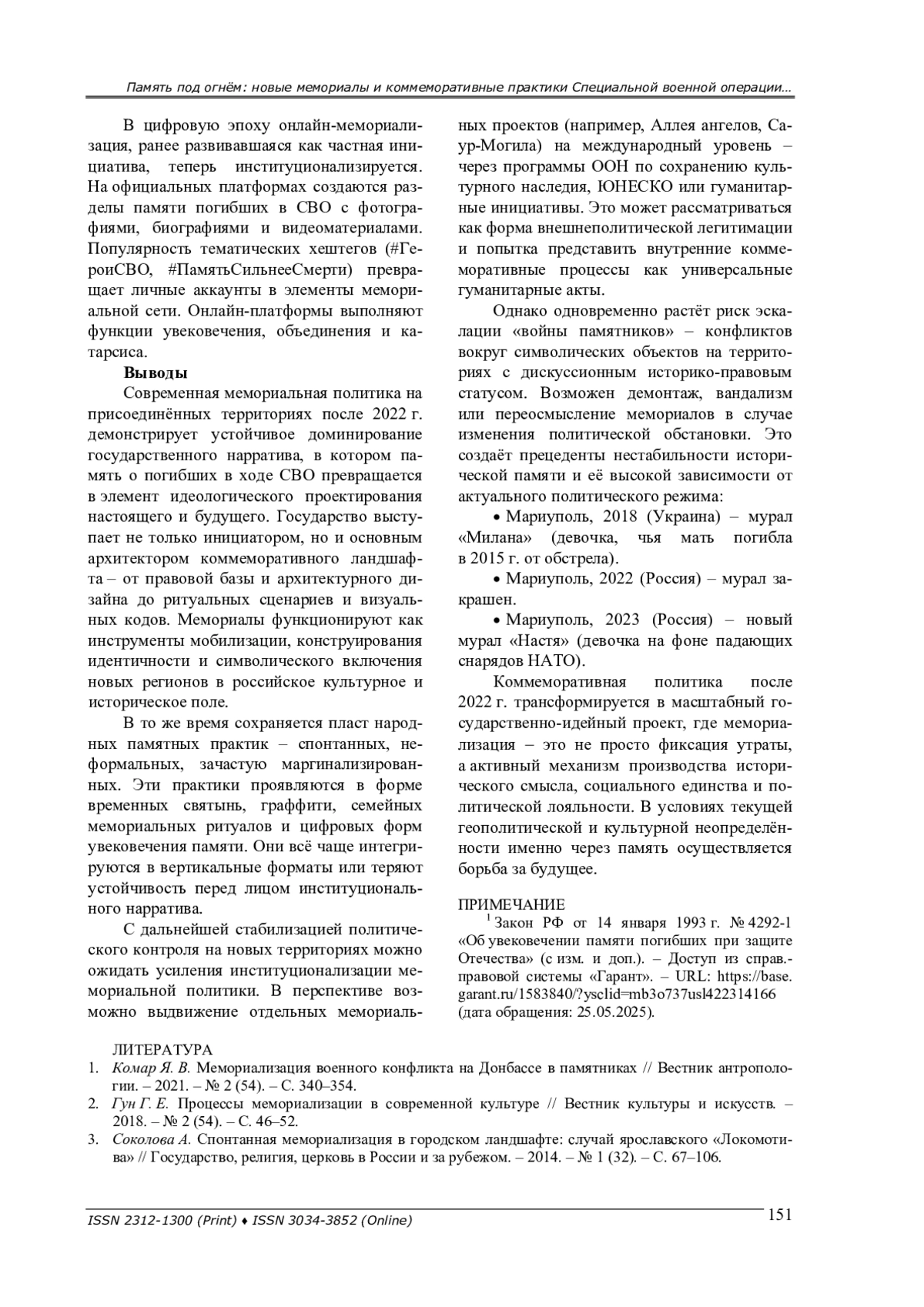 Изменение политико-правового статуса территорий, вошедших в состав Российской Федерации (далее – РФ) (Донецкой Народной республики (далее – ДНР), Луганской Народной республики (далее – ЛНР), Херсонской и Запорожской областей), стало не только юридическим актом, но и триггером актуализации исторического нарратива, ритуалов памяти и создало новые условия для формирования памяти о данном конфликте. Мемориализация как форма коллективной памяти приобрела новую интенсивность и идеологическую направленность, одновременно формируя пространственные практики памяти и изменяя символический ландшафт региона.