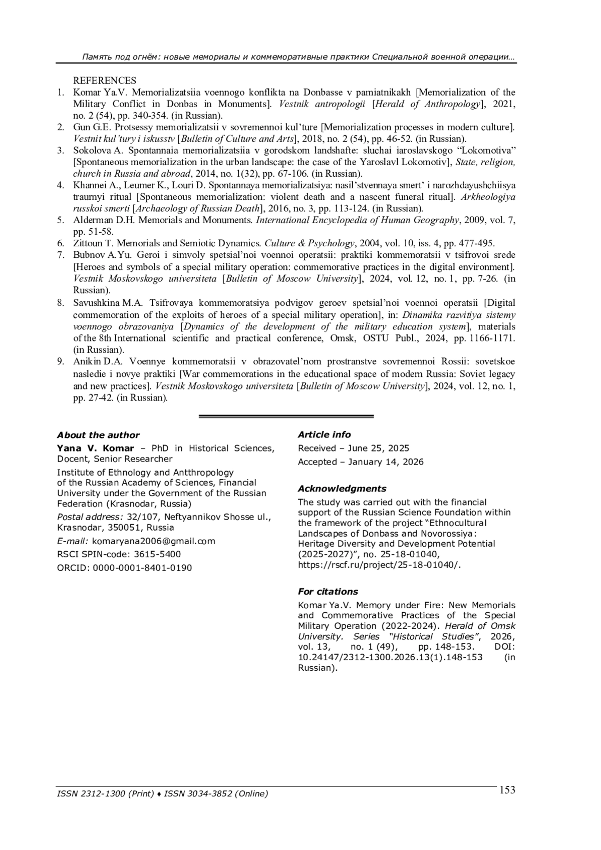 1. Комар Я. В. Мемориализация военного конфликта на Донбассе в памятниках // Вестник антропологии. - 2021. - № 2 (54). - С. 340-354.