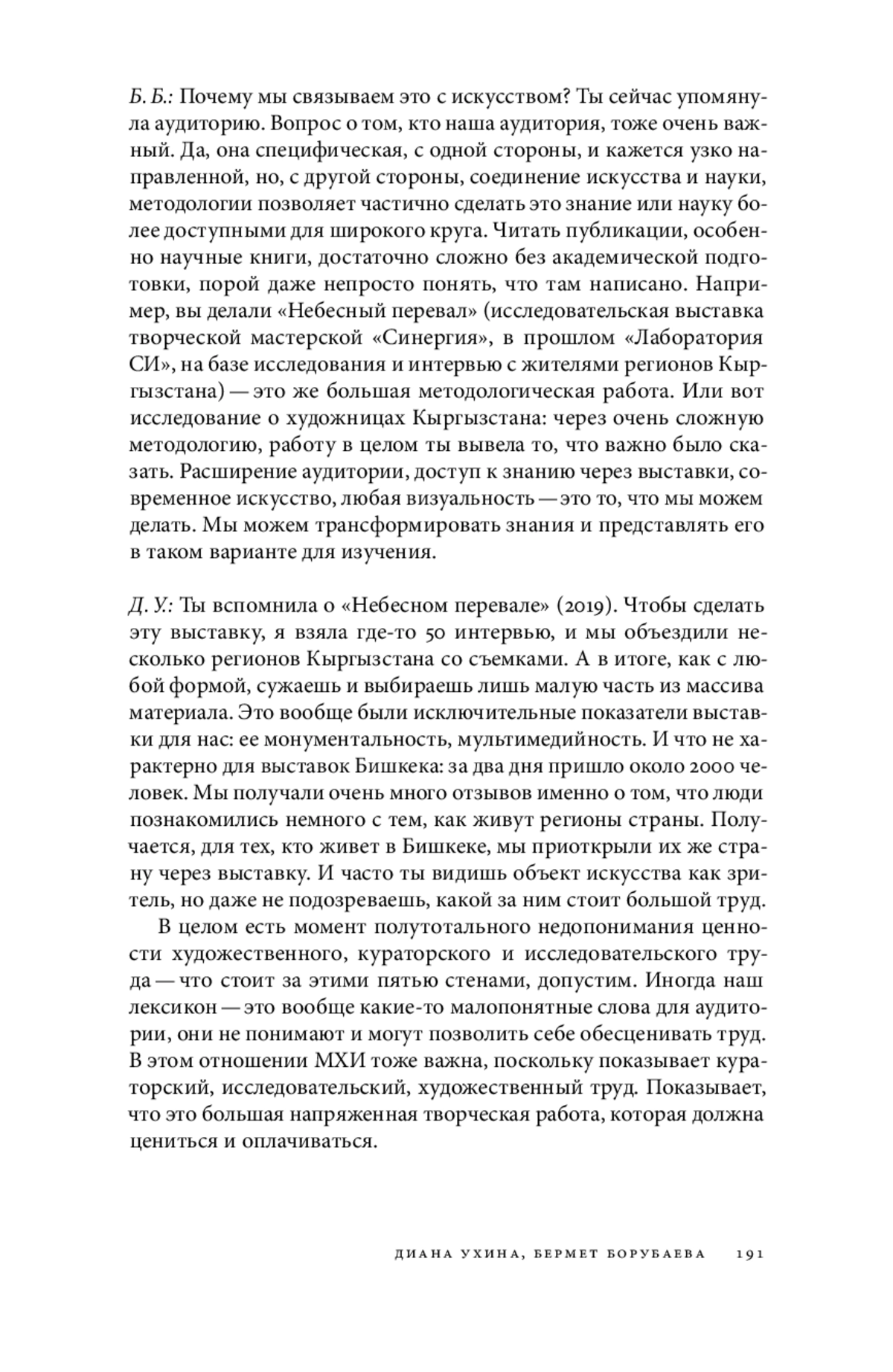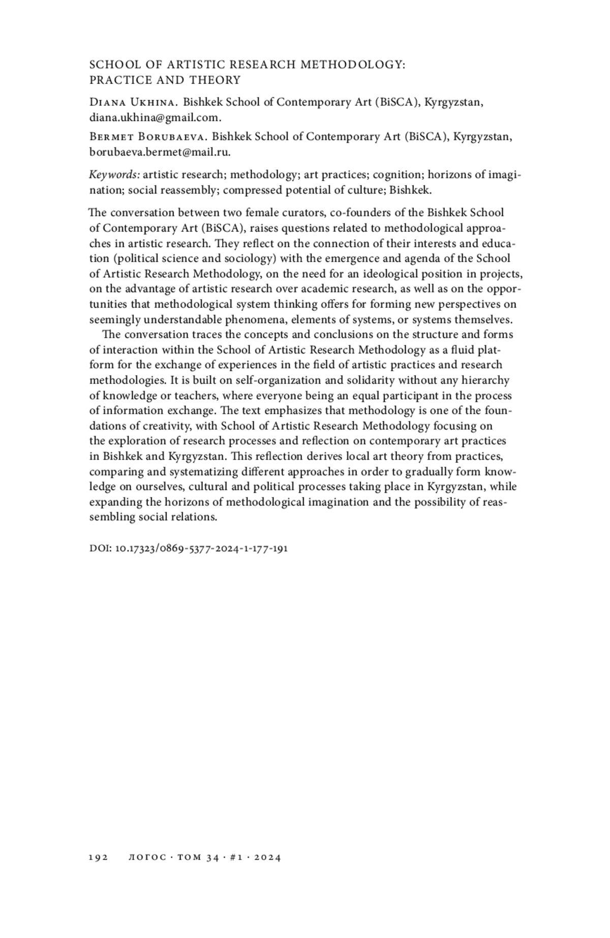 В разговоре двух кураторок — соосновательниц Бишкекской школы современного искусства (БиШСИ) — поднимаются вопросы, связанные с методологическими подходами в художественных исследованиях. Собеседницы осмысляют связь своих интересов и образовательного бэкграунда (политология и социология) с появлением и повесткой Школы методологии художественных исследований (МХИ), необходимость идеологической позиции в проектах, преимущество художественных исследований перед академическими, а также то, какие возможности открывает навык методологического системного мышления для формирования нового взгляда на кажущиеся понятными явления, элементы систем или сами системы. В процессе беседы прослеживаются концепции и выводы относительно структуры и форм взаимодействия в рамках МХИ как текучей платформы для обмена опытом в области художественных практик и методологий исследований, которая строится на самоорганизации и солидарности. В ней нет иерархии знания и учителей, а есть равные участни_цы процесса обмена информацией. В тексте подчеркивается, что методология составляет одну из основ творчества, а миссия МХИ заключается в изучении исследовательских процессов, а также рефлексии над современными практиками искусства Бишкека и Кыргызстана. Такая рефлекция предполагает выведение локальной теории искусства из практик, сравнение и систематизацию разных подходов с тем, чтобы постепенно формировать знание о самих себе, о культурных и политических процессах, происходящих на территории Кыргызстана, и вместе с этим расширение горизонтов методологического воображения и возможности пересборки социальных отношений.