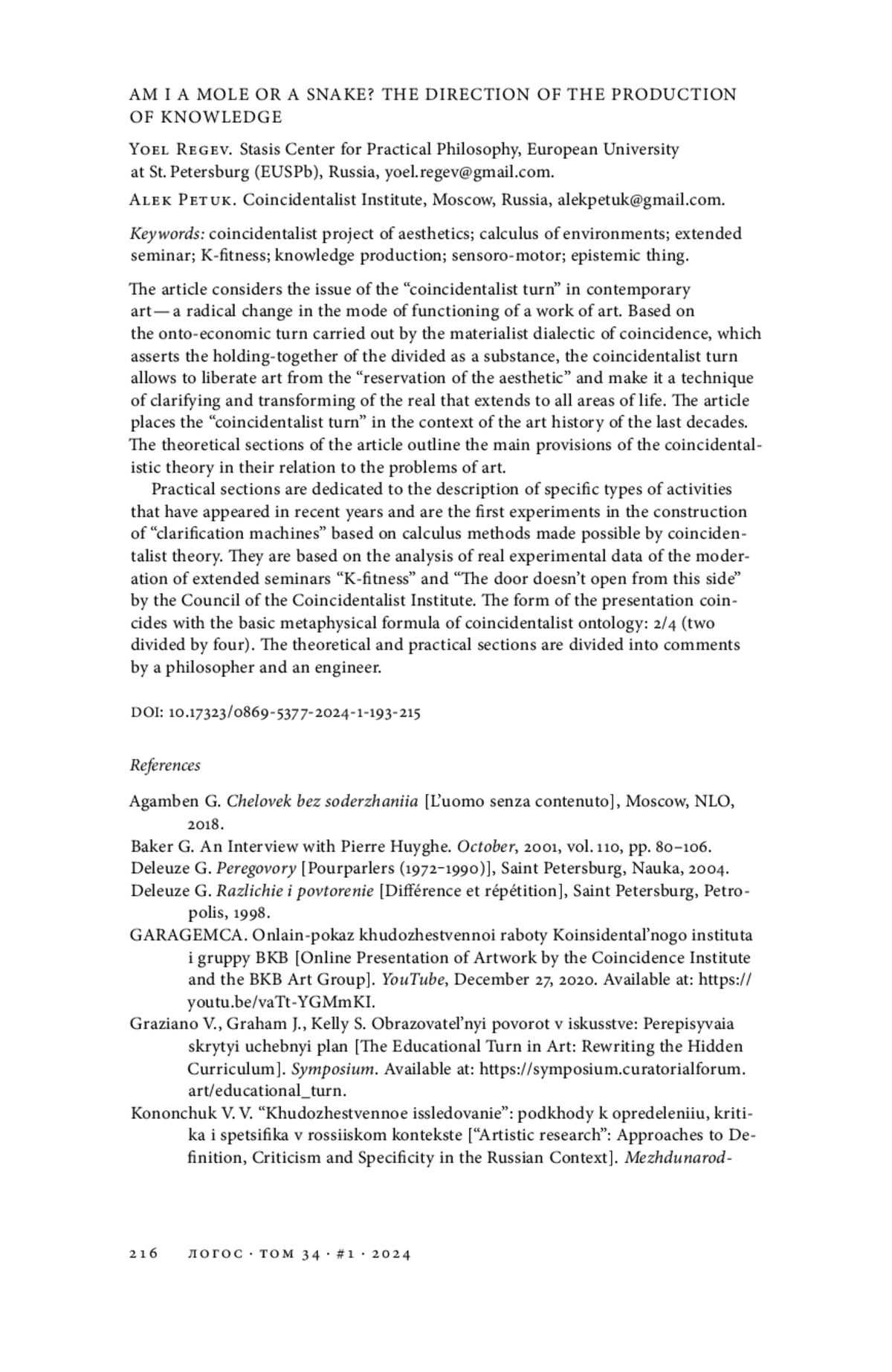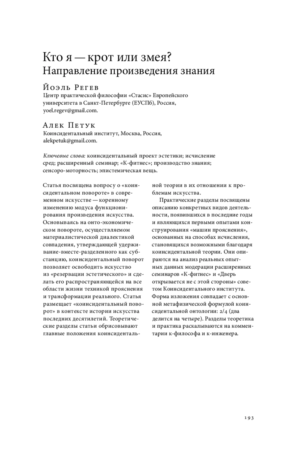 Статья посвящена вопросу о «коинсидентальном повороте» в современном искусстве — коренному изменению модуса функционирования произведения искусства. Основываясь на онто-экономическом повороте, осуществляемом материалистической диалектикой совпадения, утверждающей удерживание-вместе-разделенного как субстанцию, коинсидентальный поворот позволяет освободить искусство из «резервации эстетического» и сделать его распространяющейся на все области жизни техникой прояснения и трансформации реального. Статья размещает «коинсидентальный поворот» в контексте истории искусства последних десятилетий. Теоретические разделы статьи обрисовывают главные положения коинсидентальной теории в их отношении к проблемам искусства. Практические разделы посвящены описанию конкретных видов деятельности, появившихся в последние годы и являющихся первыми опытами конструирования «машин прояснения», основанных на способах исчисления, становящихся возможными благодаря коинсидентальной теории. Они опираются на анализ реальных опытных данных модерации расширенных семинаров «К-фитнес» и «Дверь открывается не с этой стороны» советом Коинсидентального института. Форма изложения совпадает с основной метафизической формулой коинсидентальной онтологии: 2/4 (два делится на четыре). Разделы теоретика и практика раскалываются на комментарии к-философа и к-инженера