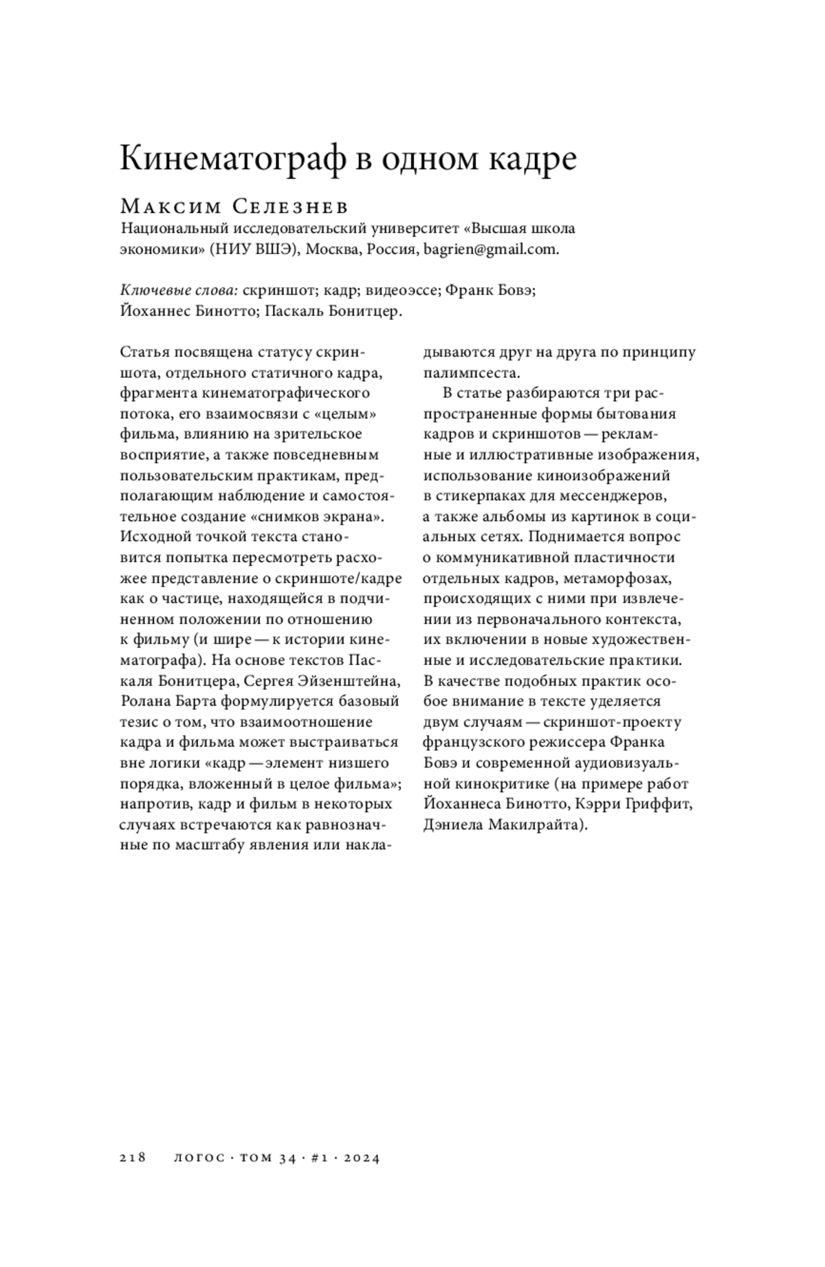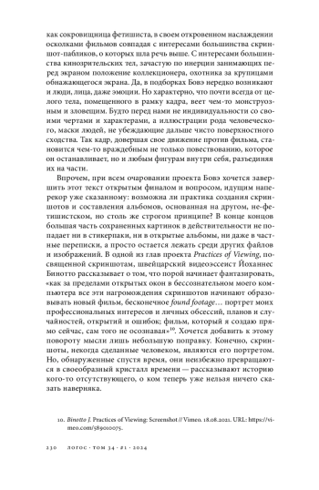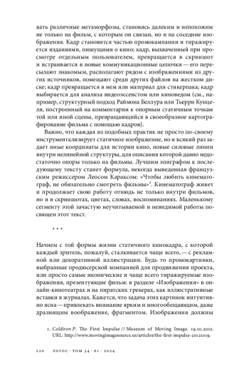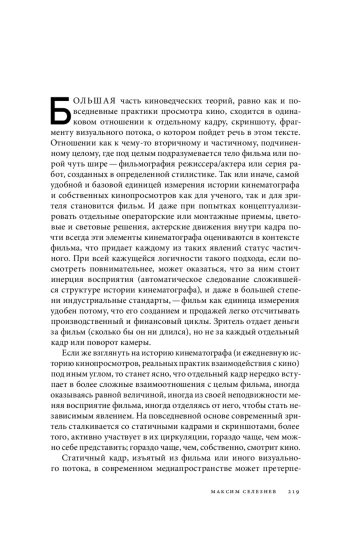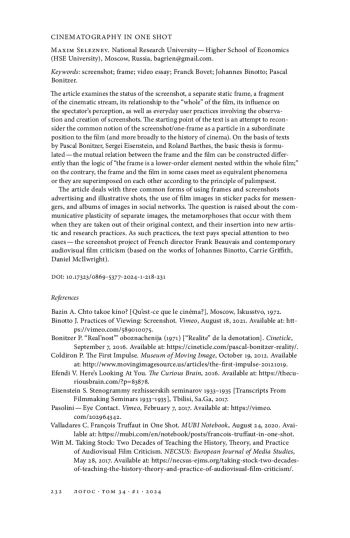 Статья посвящена статусу скриншота, отдельного статичного кадра, фрагмента кинематографического потока, его взаимосвязи с «целым» фильма, влиянию на зрительское восприятие, а также повседневным пользовательским практикам, предполагающим наблюдение и самостоятельное создание «снимков экрана». Исходной точкой текста становится попытка пересмотреть расхожее представление о скриншоте/кадре как о частице, находящейся в подчиненном положении по отношению к фильму (и шире — к истории кинематографа). На основе текстов Паскаля Бонитцера, Сергея Эйзенштейна, Ролана Барта формулируется базовый тезис о том, что взаимоотношение кадра и фильма может выстраиваться вне логики «кадр — элемент низшего порядка, вложенный в целое фильма»; напротив, кадр и фильм в некоторых случаях встречаются как равнозначные по масштабу явления или накладываются друг на друга по принципу палимпсеста. В статье разбираются три распространенные формы бытования кадров и скриншотов — рекламные и иллюстративные изображения, использование киноизображений в стикерпаках для мессенджеров, а также альбомы из картинок в социальных сетях. Поднимается вопрос о коммуникативной пластичности отдельных кадров, метаморфозах, происходящих с ними при извлечении из первоначального контекста, их включении в новые художественные и исследовательские практики. В качестве подобных практик особое внимание в тексте уделяется двум случаям — скриншот-проекту французского режиссера Франка Бовэ и современной аудиовизуальной кинокритике (на примере работ Йоханнеса Бинотто, Кэрри Гриффит, Дэниела Макилрайта).