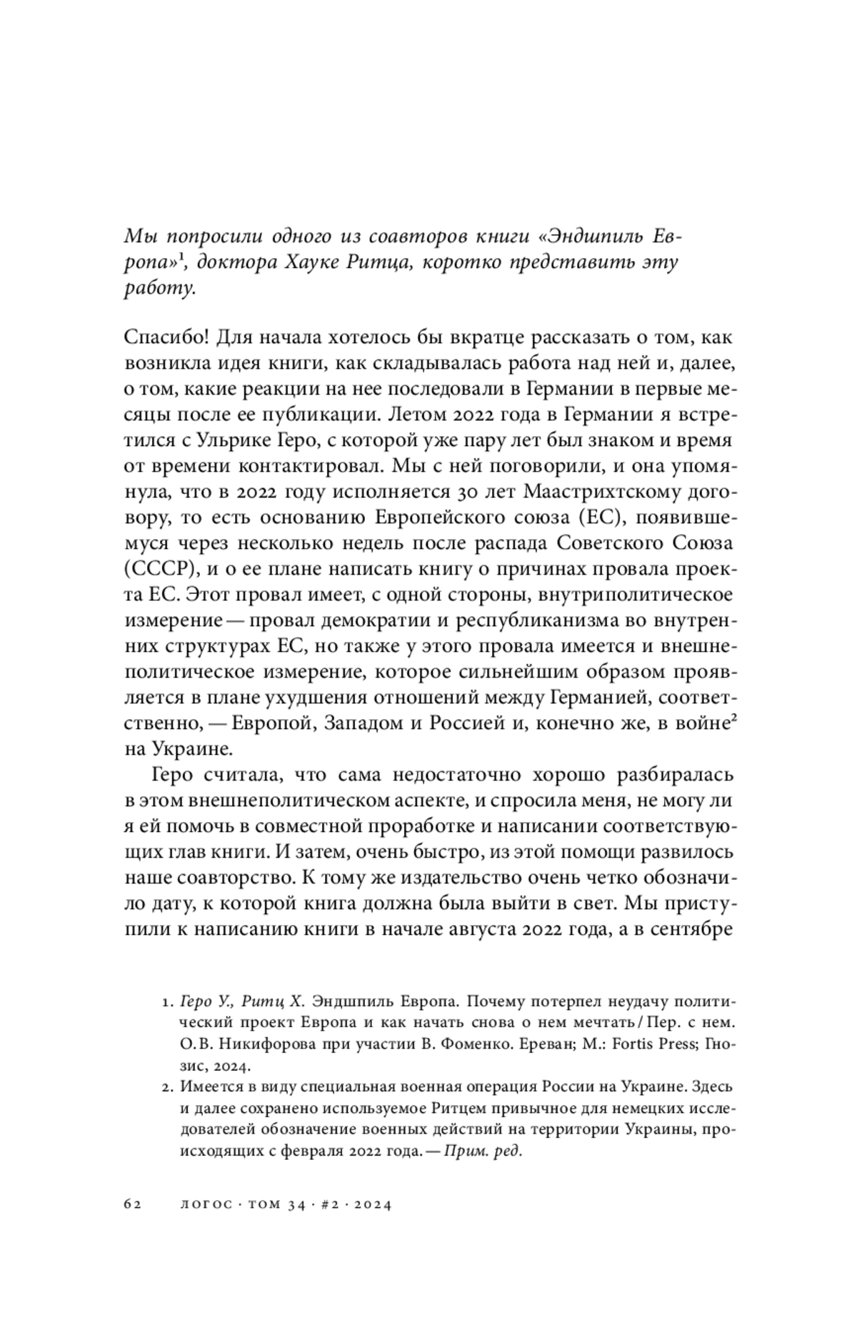 Спасибо! Для начала хотелось бы вкратце рассказать о том, как возникла идея книги, как складывалась работа над ней и, далее, о том, какие реакции на нее последовали в Германии в первые месяцы после ее публикации. Летом 2022 года в Германии я встретился с Ульрике Геро, с которой уже пару лет был знаком и время от времени контактировал. Мы с ней поговорили, и она упомянула, что в 2022 году исполняется 30 лет Маастрихтскому договору, то есть основанию Европейского союза (ЕС), появившемуся через несколько недель после распада Советского Союза (СССР), и о ее плане написать книгу о причинах провала проекта ЕС. Этот провал имеет, с одной стороны, внутриполитическое измерение — провал демократии и республиканизма во внутренних структурах ЕС, но также у этого провала имеется и внешнеполитическое измерение, которое сильнейшим образом проявляется в плане ухудшения отношений между Германией, соответственно, — Европой, Западом и Россией и, конечно же, в войне2 на Украине