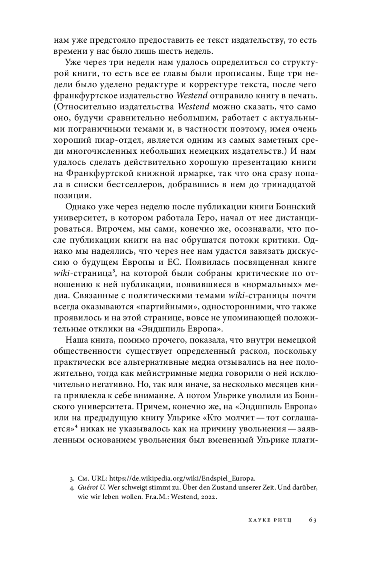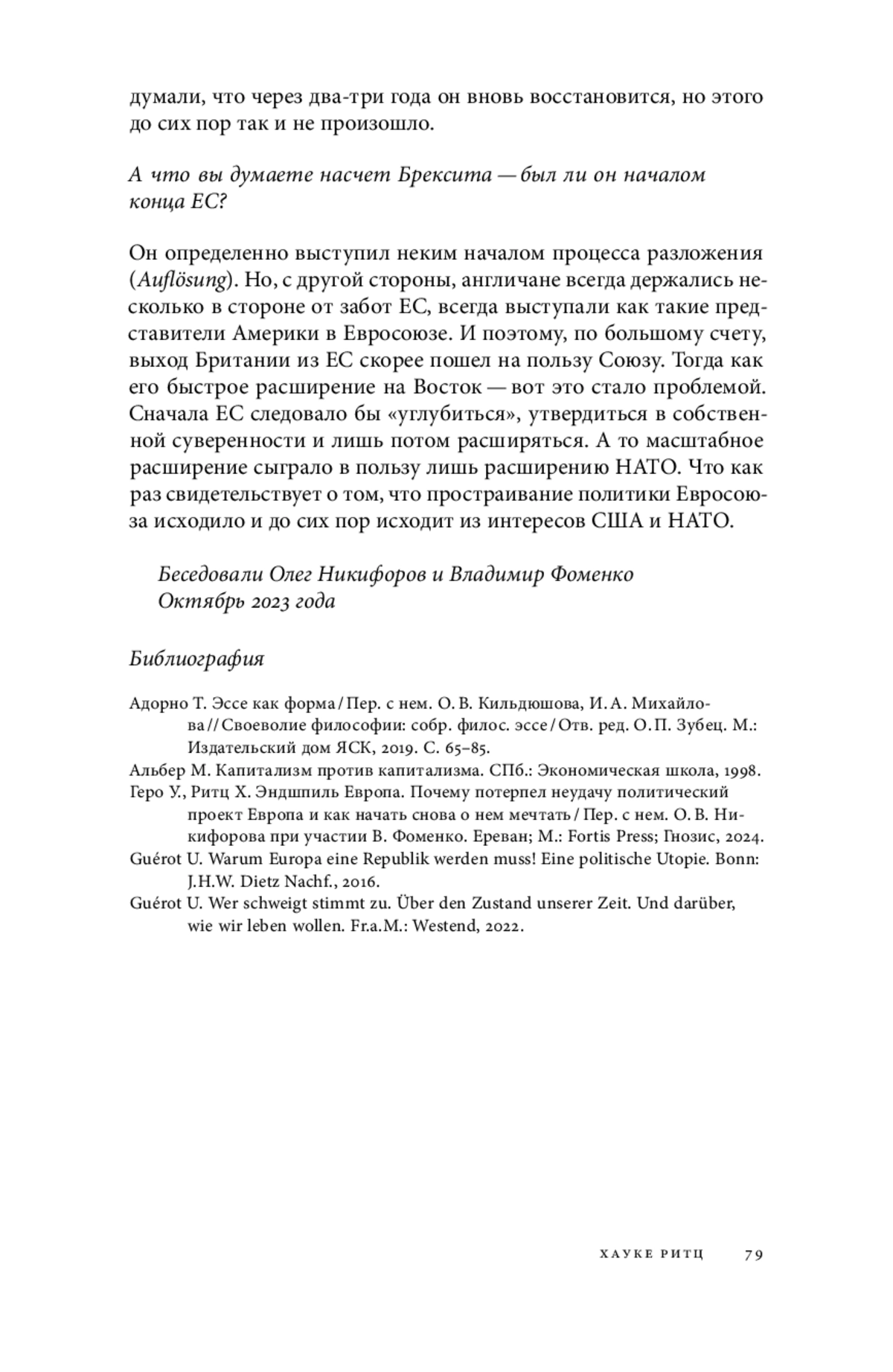 3. Геро У., Ритц Х. Эндшпиль Европа. Почему потерпел неудачу политический проект Европа и как начать снова о нем мечтать / Пер. с нем. О. В. Никифорова при участии В. Фоменко. Ереван; М.: Fortis Press; Гнозис, 2024. Guérot U. Warum Europa eine Republik werden muss! Eine politische Utopie. Bonn: J.H.W. Dietz Nachf., 2016.