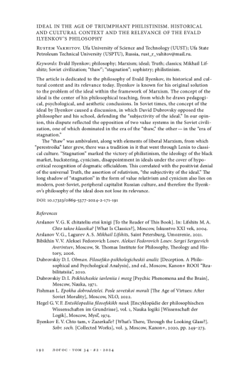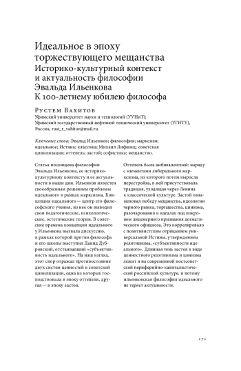 Статья посвящена философии Эвальда Ильенкова, ее историкокультурному контексту и ее актуальности в наши дни. Ильенков известен своеобразным решением проблемы идеального в рамках марксизма. Концепция идеального — центр его философского учения, из нее он выводил свои педагогические, психологические, эстетические теории. В советские времена концепция идеального у Ильенкова вызвала дискуссию, в рамках которой против философа и его школы выступил Давид Дубровский, отстаивавший «субъективность идеального». На наш взгляд, этот спор отражал противостояние двух систем ценностей в советской цивилизации, одна из которых господствовала в эпоху оттепели, другая — в эпоху застоя. Оттепель была амбивалентной: наряду с элементами либерального марксизма, из которого потом выросла перестройка, в ней присутствовала традиция, уходящая через Ленина к классической культуре. Застой ознаменовал победу мещанства, идеологии черного рынка, торгашества, цинизма, разочарования в идеалах под покровом лицемерного признания догматического официоза. Это коррелировало с позитивистским отрицанием универсальной Истины, утверждением релятивизма, «субъективности идеального». Длинная тень застоя в виде ценностного релятивизма и цинизма лежит и на современной постсоветской периферийно-капиталистической российской культуре, и потому ильенковская философия идеального не теряет актуальности.