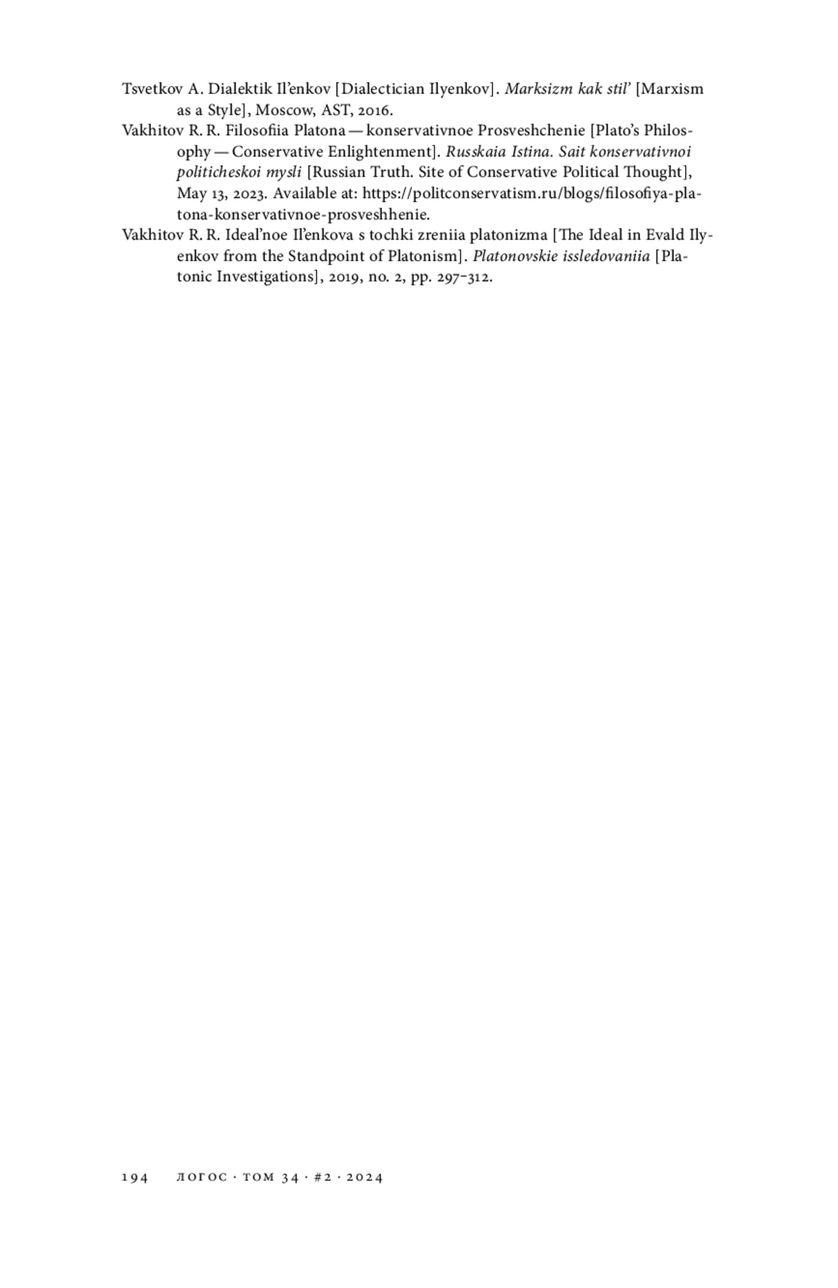 4. Вахитов Р. Р. Идеальное Ильенкова с точки зрения платонизма // Платоновские исследования. 2019. № 2. С. 297-312. EDN: VIVSGK
