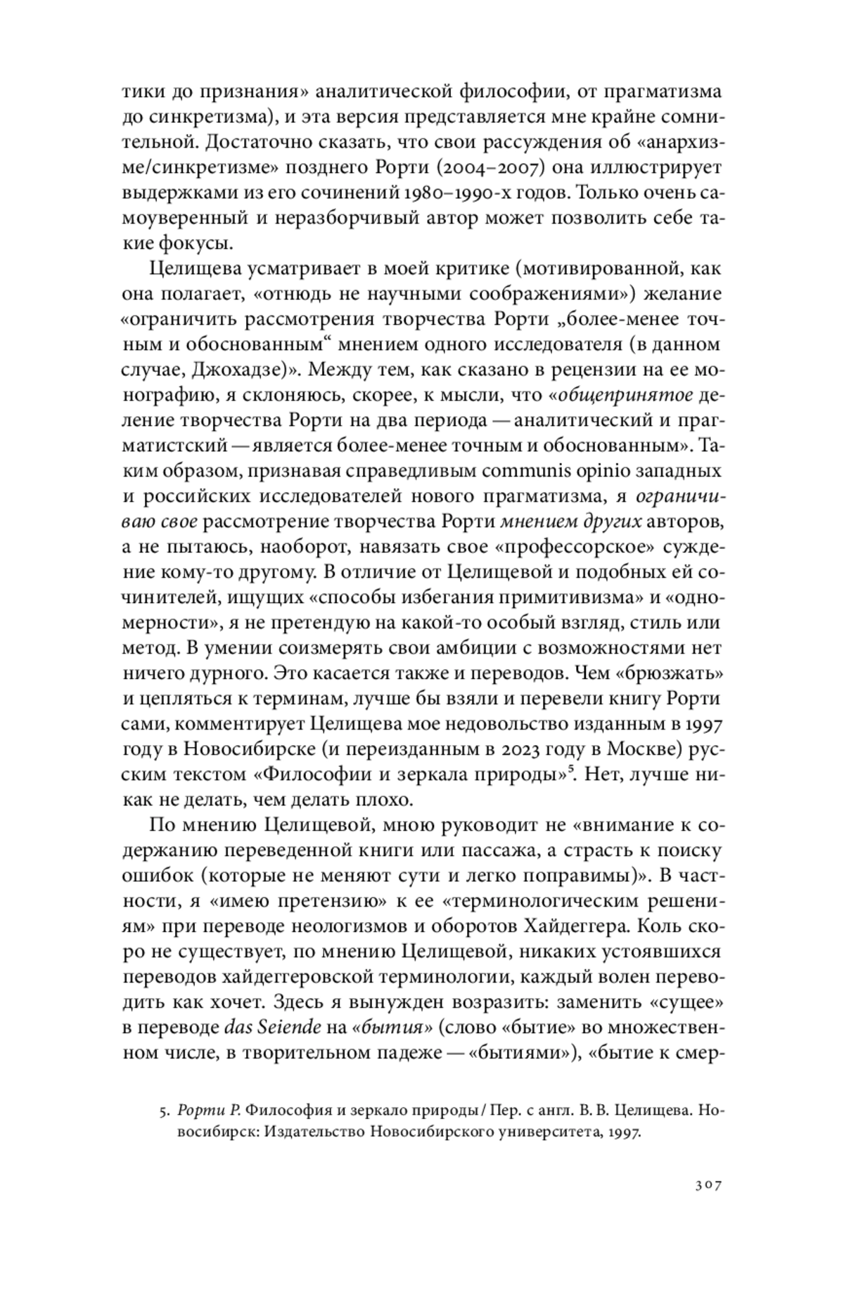 В статье представлен ответ критическому обзору Игоря Джохадзе книги Оксаны Целищевой «Ричард Рорти: „маргинальный аналитический философ“». Главный упрек Джохадзе состоит в неверном, с его точки зрения, изображении фигуры Рорти, который, по версии Джохадзе, являет собой «философа-моноидеиста, на протяжении 35 лет своей жизни придерживавшегося одной, в сущности, неизменной позиции [прагматиста]». Автор отвергает этот приписываемый Рорти «моноидеизм», показывая, что, во-первых, Джохадзе игнорирует оценки собственной философии со стороны Рорти и, во-вторых, неправомерно ограничивает его философскую эволюцию — от лингвистического поворота к аналитической философии и ее критике и последующий разворот ко все более богатой палитре философской прозы с присущими ей релятивизмом, синкретизмом, экуменизмом и плюрализмом. Автор подвергает сомнению уверенность Джохадзе в том, что «прагматизм» Рорти исключает упомянутую выше эволюцию взглядов философа, показывая, что сам прагматизм выступает зонтичным термином для довольно разнообразных философских приемов и взглядов. В статье опровергается поддерживаемый Джохадзе расхожий взгляд, что критика аналитической философии вылилась в окончательный отказ Рорти от ее методов и ценностей, и показано, что эволюция его философии привела к признанию ее паритета с признанной им «наставительной, революционной, герменевтической» философией. Именно об этом свидетельствует название книги Целищевой, цитирующее признание самого Рорти. В отличие от Джохадзе автор полагает важнейшей темой переописание Рорти самого себя, которое нашло отражение в эволюции его взглядов на суть философии, от «философии как разговора человечества» до «философии как культурной политики». Критические оценки в адрес других исследователей с целью ограничить рассмотрения творчества Рорти «более-менее точным и обоснованным» мнением одного исследователя (в данном случае, Джохадзе), мотивированы отнюдь не научными соображениями, на которые указываются в данной статье