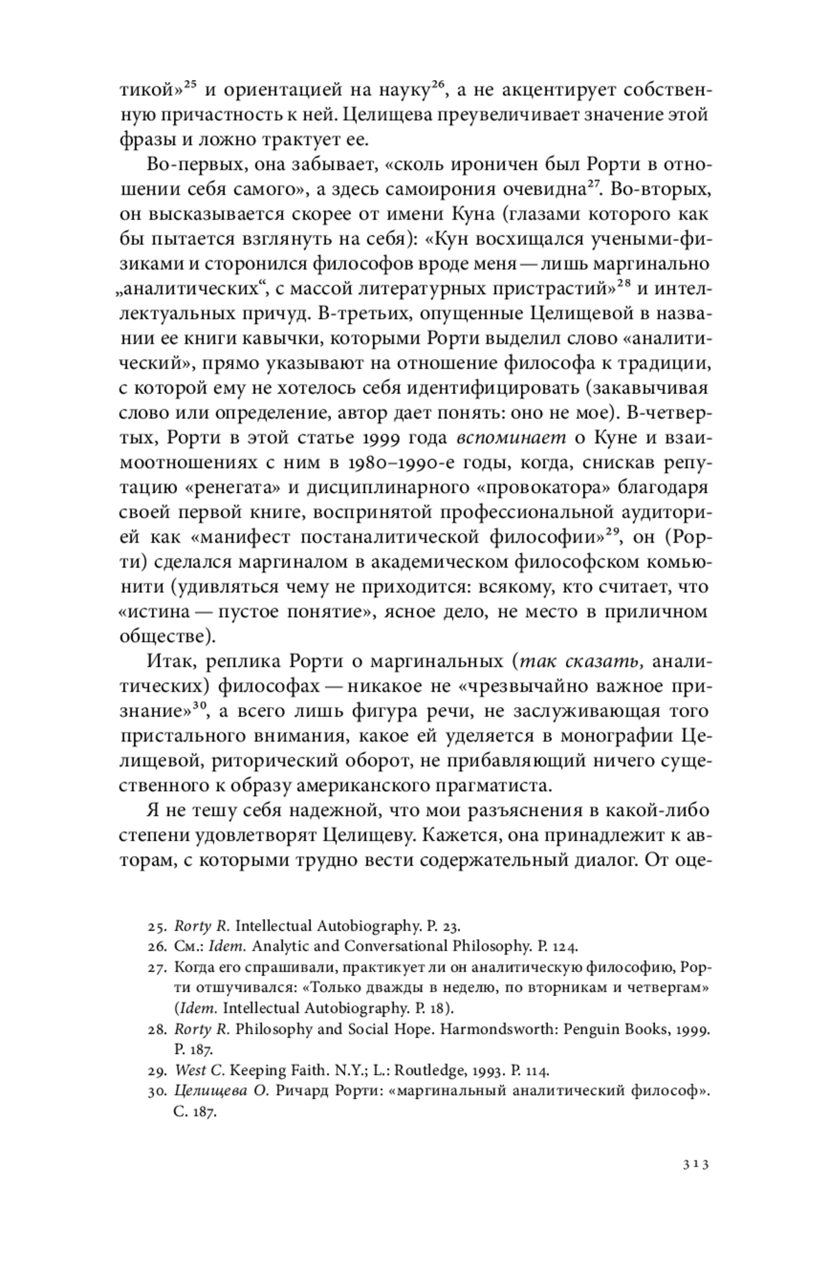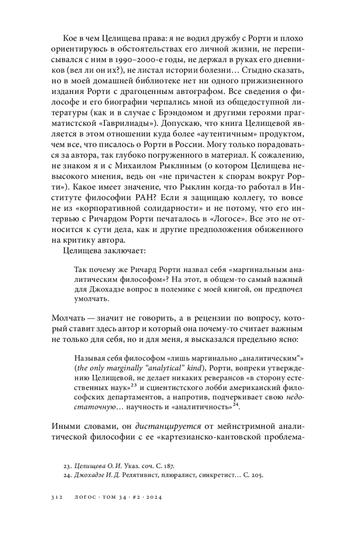 Все-таки полезно иногда писать рецензии на работы коллег по цеху. Из ответов на критику можно узнать много интересного, пусть и не всегда приятного. Оксана Целищева открыла мне глаза на меня самого. Оказывается, «профессор Джохадзе» претендует на роль «главного рортиведа» в России, пытается «монополизировать» эту область исследований (усматривая в каждом, кто осмеливается на нее посягнуть, опасного конкурента), а последняя его книга о прагматизме, лишенная какой-либо оригинальности, не тянет на серьезную монографию и является «нечитаемой» (скорее, видимо, нечитабельной). Кратко отвечу на эти и некоторые другие деликатно сформулированные коллегой замечания