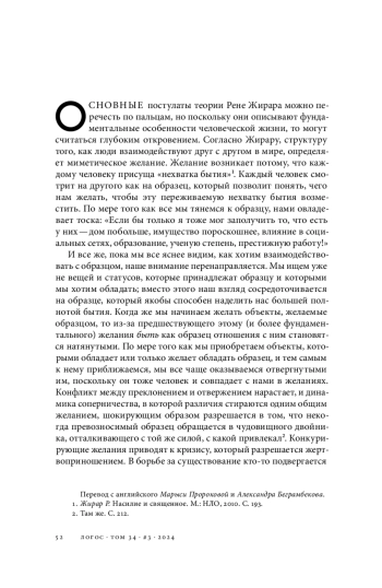 Основные постулаты теории Рене Жирара можно перечесть по пальцам, но поскольку они описывают фундаментальные особенности человеческой жизни, то могут считаться глубоким откровением. Согласно Жирару, структуру того, как люди взаимодействуют друг с другом в мире, определяет миметическое желание. Желание возникает потому, что каждому человеку присуща «нехватка бытия»1. Каждый человек смотрит на другого как на образец, который позволит понять, чего нам желать, чтобы эту переживаемую нехватку бытия возместить. По мере того как все мы тянемся к образцу, нами овладевает тоска: «Если бы только я тоже мог заполучить то, что есть у них — дом побольше, имущество пороскошнее, влияние в социальных сетях, образование, ученую степень, престижную работу!»
