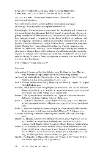 Выявляя основные черты феминистской теории последних сорока лет, по-прежнему значимые для нее сегодня, автор утверждает, что миметическая теория Рене Жирара предлагает убедительную критику «политики идентичности» — понятия, которое некоторые феминистские теоретики привлекали для анализа неравенства. Она также позволяет лучше понять феномены эскалирующего соперничества между группами со схожими интересами, которые анализируются на примере недавних столкновений между феминистскими учеными и защитниками прав. В свою очередь, феминистская теория может внести определенный вклад в миметическую. Миметическая теория пренебрегала тем фактом, что центральную роль в человеческой жизни играет чувственный опыт, который может как фиксировать травму и страдания, так и служить средством исцеления и преображения. Миметическая теория может продвинуться вперед, если исследователи-жирардианцы признают важность чувственного опыта, как она подчеркивалась в феминистской теории, и станут усматривать в нем импульс для перехода от насильственного мимезиса к глубинной медиации