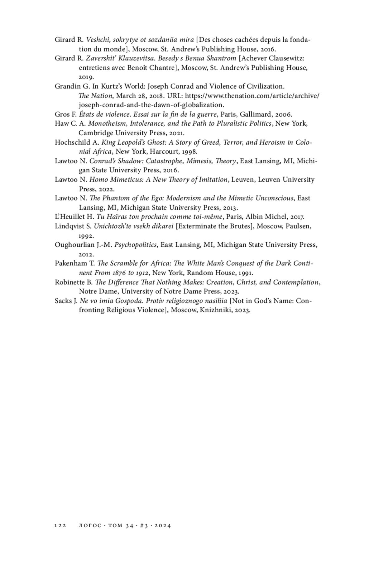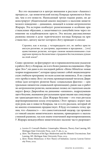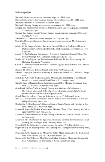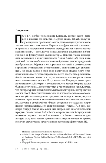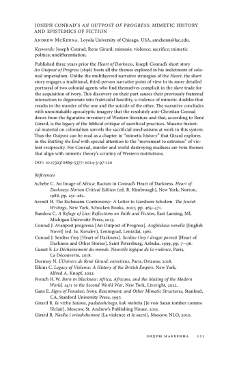 Рассказ Джозефа Конрада «Аванпост прогресса» (1896) был написан за три года до «Сердца тьмы», но уже включал все темы, затронутые в этом позднейшем вердикте колониальному империализму. В отличие от многослойных повествовательных стратегий «Сердца тьмы», в этом рассказе используется традиционное повествование от третьего лица, подробно изображающее двух колониальных деятелей, которые оказываются замешанными в работорговле ради приобретения слоновой кости. Это приводит к тому, что их братские взаимоотношения вырождаются в братоубийственную вражду — насилие миметических двойников, которое приводит к убийству одного и самоубийству другого. Повествование завершается легко узнаваемыми апокалиптическими образами, которые открытый антихристианин Конрад черпает из образного инвентаря западной литературы и которые, по словам Рене Жирара, являются наследием библейской критики жертвоприношений. Обширный исторический материал на тему колониализма раскрывает действующие в этой системе механизмы жертвоприношения. Таким образом, «Аванпост» можно рассматривать как главу в «миметической истории», которую Жирар исследует в своей работе «Завершить Клаузевица», уделяя особое внимание «устремлению к крайности» во взаимном насилии. Для Конрада убийство и безумие, разрушающее мир, — темы-близнецы, которые хорошо ложатся на исследование западных институтов миметической теорией.