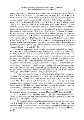 Анализ актуальных исследований интеллекта позволяет очертить основные векторы развития современной психологии интеллекта. В рамках сформированной в первой половине XX века традиции исследования интеллекта продолжаются разработки структурных моделей интеллекта и изучение его свойств (Р. Стернберг, Х. Гарднер, А. Дженсен, Л. М. Веккер, Я. А. Пономарев и др.). Второе направление исследований затрагивает область изучения интеллекта в контексте его включенности в продуктивную деятельность и эффективное решение задач (В. Н. Дружинин, В. Д. Шадриков, В. А. Мазилов и др.). К третьему направлению можно отнести теоретико-методологические поиски ответа на вопрос о природе интеллекта, факторов, обусловливающих его проявление (М. А. Холодная, Д. А. Ушаков, Ж. Пиаже, Р. Кеттелл и др.). Не менее актуальным является изучение связи интеллекта и личности, её ментального опыта, включенности в интеллектуальную деятельность (М. М. Мишина, М. А. Холодная, Lazar Stankov, Gregory J. Boyle, Raymond B. Cattell и др.). К пятому вектору развития можно отнести исследования в области искусственного интеллекта, которые, с одной стороны, направлены на создание технической модели интеллекта, а с другой, связаны с моделированием интеллектуальных действий человека на программном и аппаратурном уровнях (К. Дортмут, К. Минский, Г. Саймон, А. Ньюэлл, Н. Хомский и др.). В рамках данных исследований особую область занимает вопрос использования ИИ в психологической практике (Корж Е. М., Громова А. В., Matthews M., Coyle D., Fitzpatrick K. K., Darcy A., Vierhile M., Luxton D. D., и др.). Так, Корж Е. М., Громова А. В. отмечают: «…виртуальные или роботизированные «терапевты» включают в себя социально-интеллектуальный алгоритм, который реагирует в рамках встроенного алгоритма независимо от экспертного мнения» (Корж, Громова, 2023, с.34).