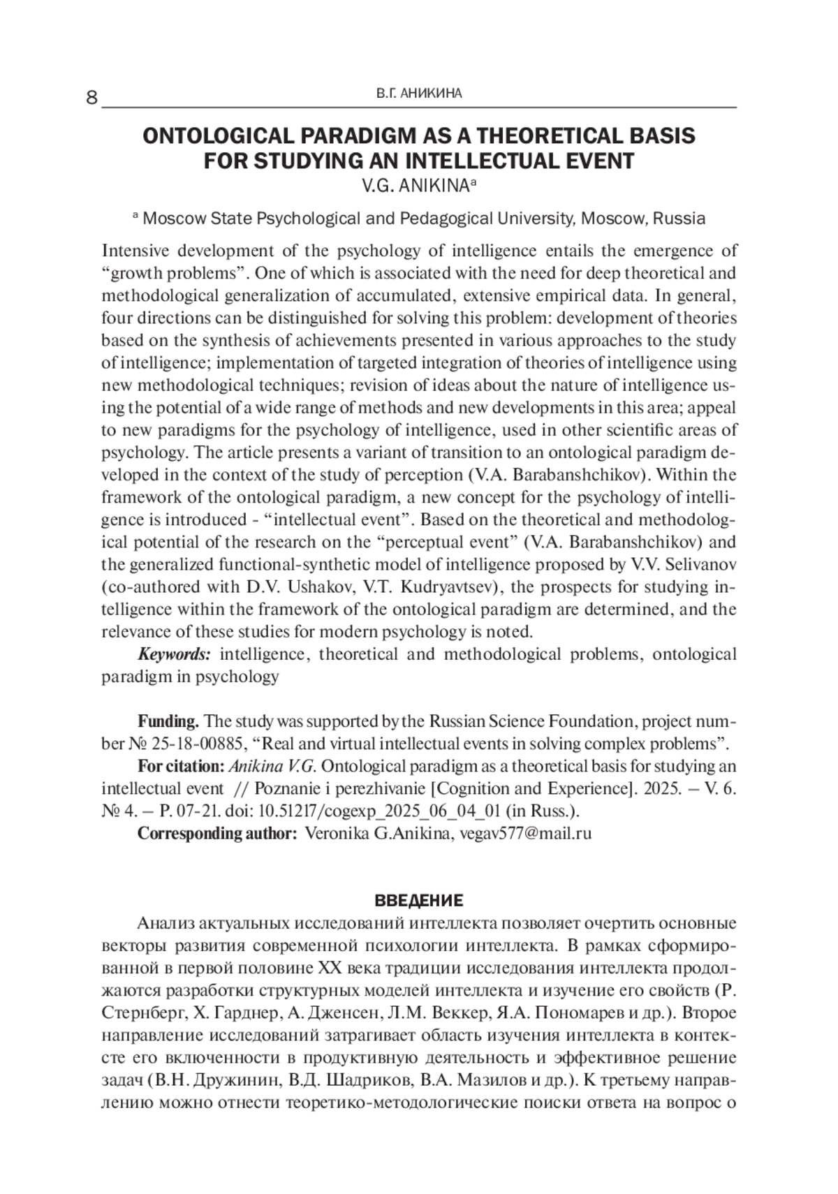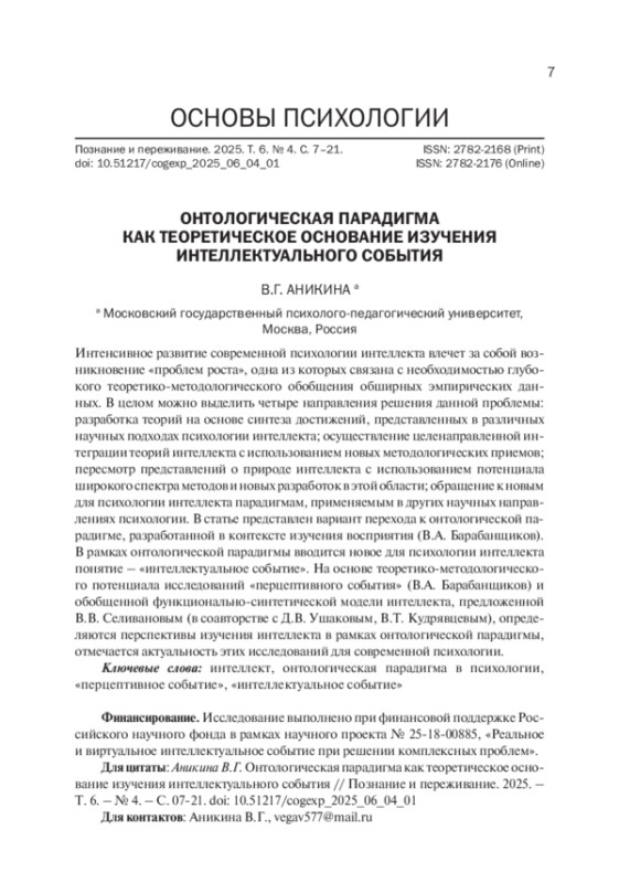 Интенсивное развитие современной психологии интеллекта влечет за собой возникновение «проблем роста», одна из которых связана с необходимостью глубокого теоретико-методологического обобщения обширных эмпирических данных. В целом можно выделить четыре направления решения данной проблемы: разработка теорий на основе синтеза достижений, представленных в различных научных подходах психологии интеллекта; осуществление целенаправленной интеграции теорий интеллекта с использованием новых методологических приемов; пересмотр представлений о природе интеллекта с использованием потенциала широкого спектра методов и новых разработок в этой области; обращение к новым для психологии интеллекта парадигмам, применяемым в других научных направлениях психологии. В статье представлен вариант перехода к онтологической парадигме, разработанной в контексте изучения восприятия (В. А. Барабанщиков). В рамках онтологической парадигмы вводится новое для психологии интеллекта понятие – «интеллектуальное событие». На основе теоретико-методологического потенциала исследований «перцептивного события» (В. А. Барабанщиков) и обобщенной функционально-синтетической модели интеллекта, предложенной В. В. Селивановым (в соавторстве с Д. В. Ушаковым, В. Т. Кудрявцевым), определяются перспективы изучения интеллекта в рамках онтологической парадигмы, отмечается актуальность этих исследований для современной психологии.