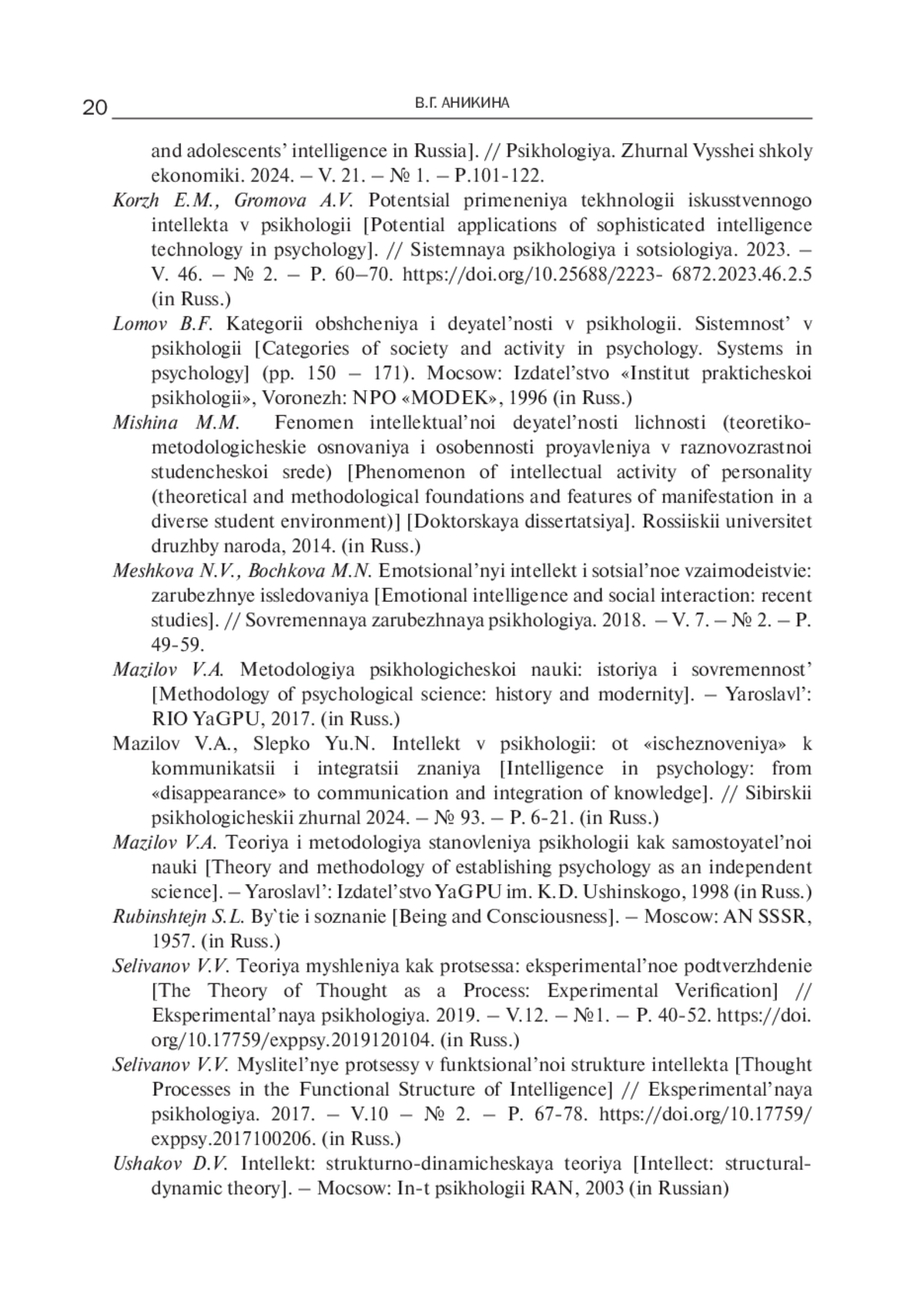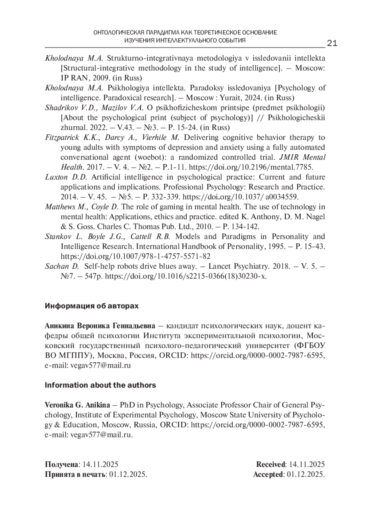 13. Мазилов В.А., Слепко Ю.Н. Интеллект в психологии: от “исчезновения” к коммуникации и интеграции знания // Сибирский психологический журнал. 2024. - № 93. - С. 6-21.