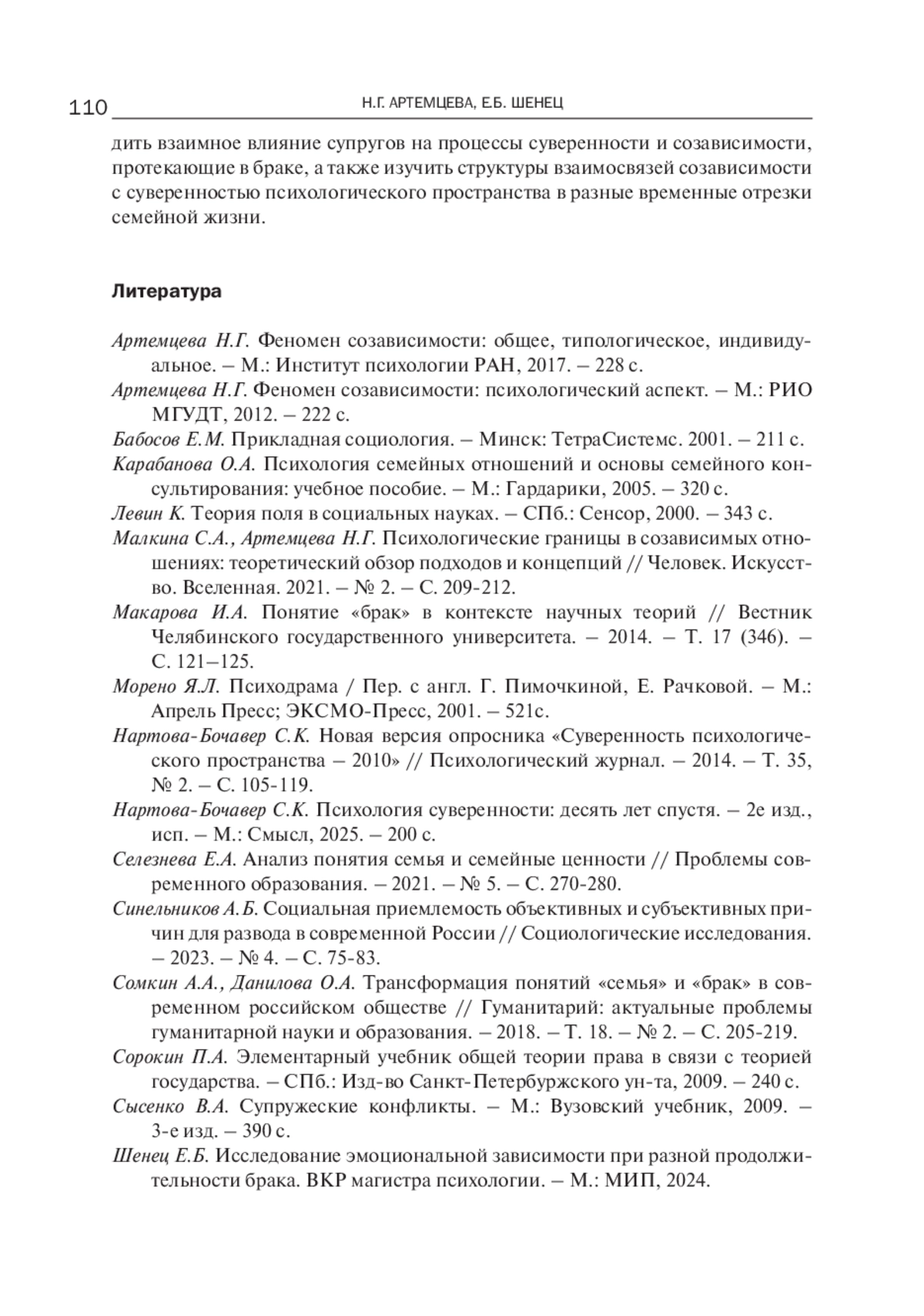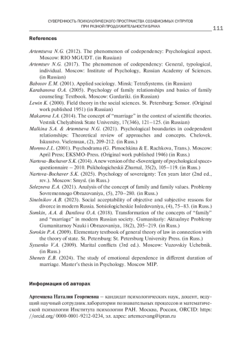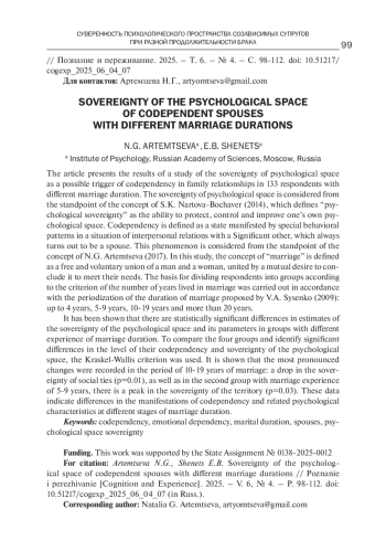 В статье представлены результаты исследования суверенности психологического пространства как возможного триггера созависимости в семейных отношениях у 133 респондентов с разной продолжительностью брака. Суверенность психологического пространства рассматривается с позиций концепции С. К. Нартовой-Бочавер (2014), которая определяет «психологическую суверенность» как способность защищать, контролировать и совершенствовать собственное психологическое пространство. Созависимость определяется как состояние, проявляющееся особенными поведенческими паттернами в ситуации межличностных отношений со «значимым другим», которым всегда оказывается супруг или супруга. Этот феномен рассматривается с позиций концепции Н. Г. Артемцевой (2017). В рамках данного исследования понятие «брак» определяется как свободный и добровольный союз мужчины и женщины, объединенных обоюдным желанием его заключить для удовлетворения своих потребностей. Деление респондентов на группы по критерию количества лет, прожитых в браке, осуществлялось в соответствии с периодизацией продолжительности брака, предложенной В. А. Сысенко (2009): до 4 лет, 5-9 лет, 10-19 лет и более 20 лет. Показано, что существуют статистически значимые различия оценок суверенности психологического пространства и ее параметров у групп с разным стажем продолжительности брака. Для сравнения четырёх групп и выявления значимых различий в показателях их созависимости и суверенности психологического пространства применялся критерий Краскела-Уоллиса.