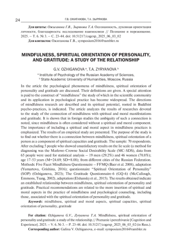 В статье рассматриваются психологические феномены осознанности, духовной ориентации личности, благодарности. Приводятся их определения. Особое внимание уделено конструкту «осознанность», изучение которого в научной среде и применение в психологической практике, получило широкое распространение в последнее время. Описываются направления исследования осознанности и указывается ее духовный потенциал, уходящий корнями в буддийские психопрактики. Анализируются результаты исследований, посвященных изучению связи осознанности с духовно-нравственными проявлениями и благодарностью. Показано, что в зарубежных исследованиях отмечается неоднозначность такой связи, так как осознанность часто рассматривается без духовно-нравственной составляющей. Подчеркивается важность включения духовно-нравственного аспекта в практики осознанности. Приводятся результаты проведенного эмпирического исследования, цель которого - выяснить, существует ли связь между осознанностью, духовной ориентацией личности как составляющей духовных способностей и благодарностью. Выборка - 70 респондентов; после исключения 5 человек, показавших неудовлетворительные результаты по шкале лжи (Методика диагностики самооценки мотивации одобрения Марлоу-Крауна), для проведения статистического анализа использовались данные 65 человек, из них 19 мужчин (29,2%) и 46 женщин (70,8%); возраст 17-53 года (М=24,69; SD=8,08); из разных городов России. Методики: Пятифакторный опросник осознанности (ПФОО), адаптация (Юмартова, Гришина, 2016); опросник «Духовная ориентация личности» (ДОЛ) (Ожиганова, 2023); опросник «Шкала чувства благодарности», адаптация (Елшанский с соавт., 2015). Полученные результаты свидетельствуют об установленной взаимосвязи осознанности, духовной ориентации личности и благодарности. Практические рекомендации связаны с включением в практики осознанности и психологическое консультирование духовно-нравственных аспектов, в том числе имеющих отношение к духовной ориентацией личности и благодарности