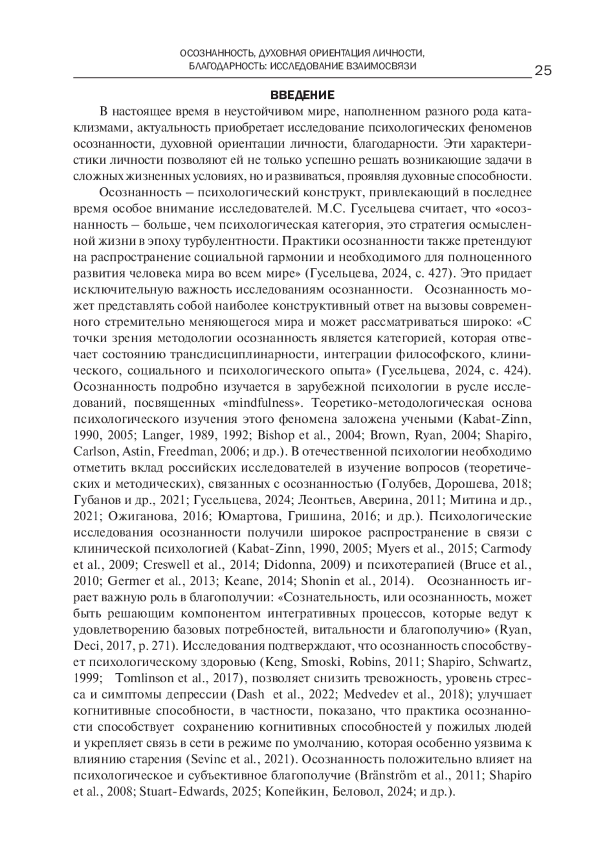 3. Гусельцева М.С. Осознанность как фактор устойчивости личности в меняющемся мире // Вестник Санкт-Петербургского университета. Психология. 2024. - Т. 14. - №. 3. - С. 414-433. DOI: 10.21638/spbu16.2024.302