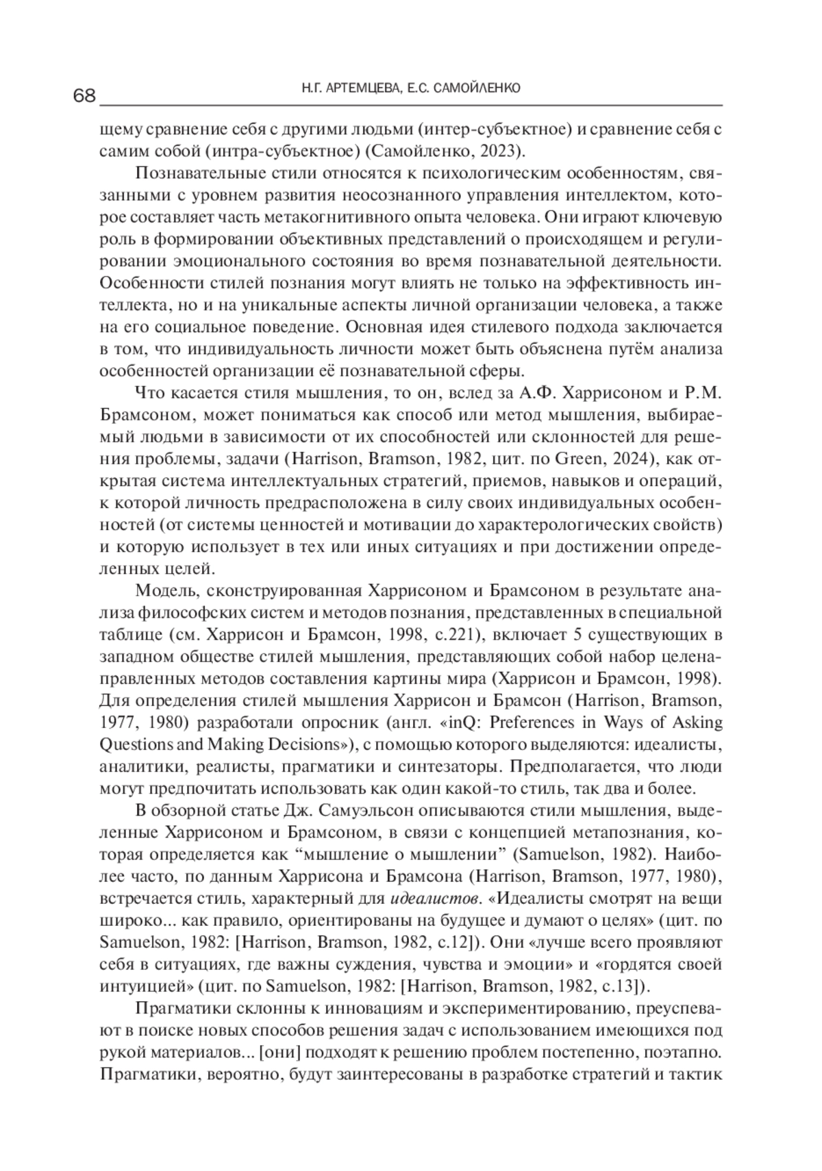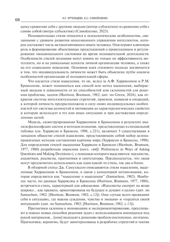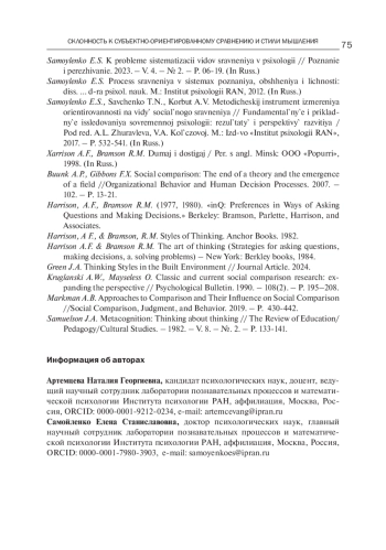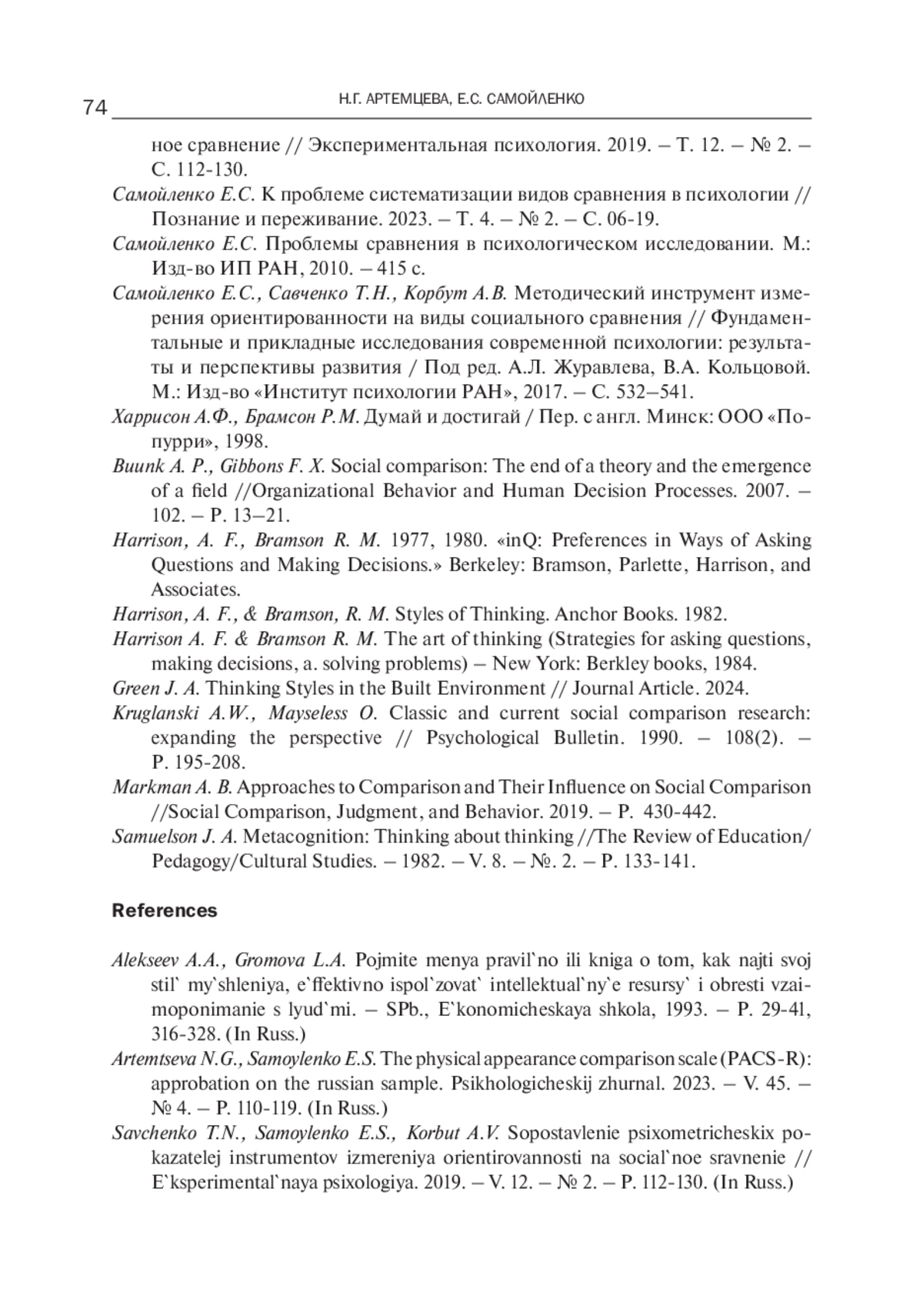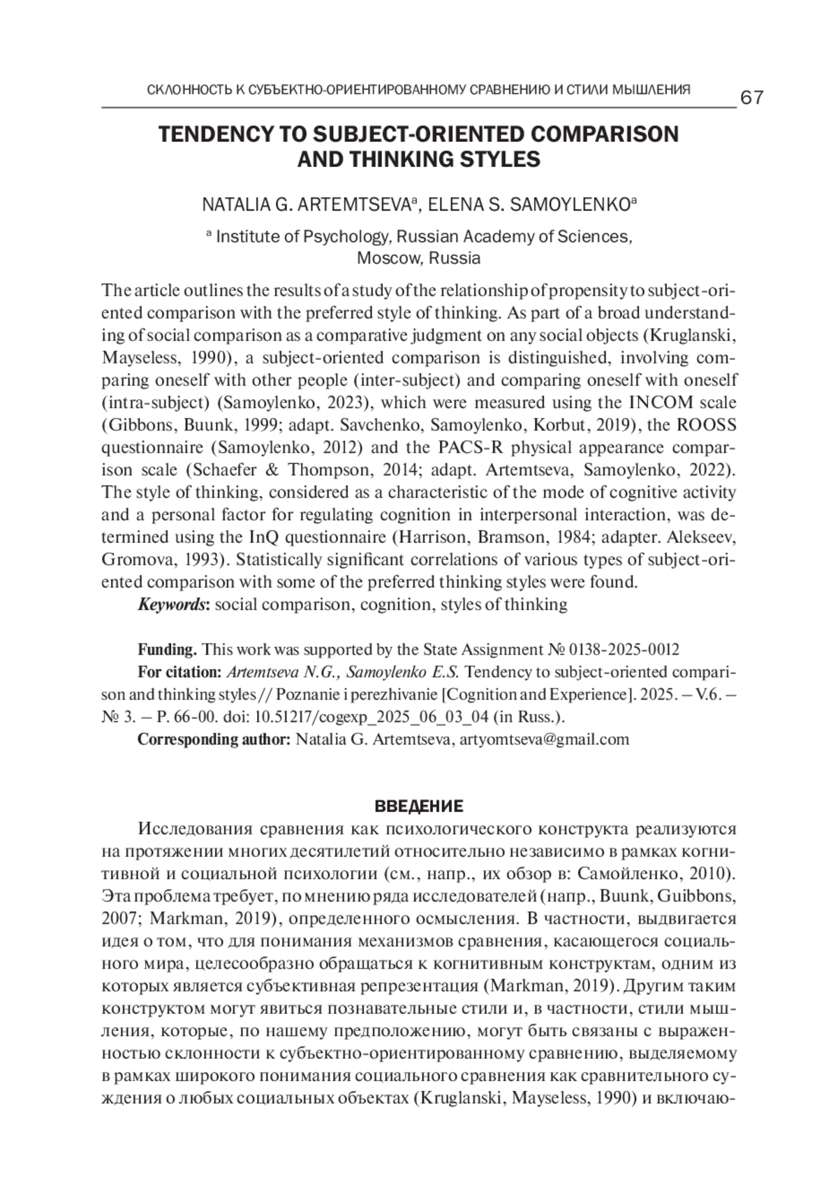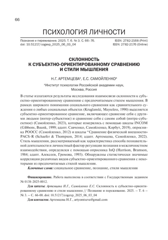 В статье излагаются результаты исследования взаимосвязи склонности к субъектно-ориентированному сравнению с предпочитаемым стилем мышления. В рамках широкого понимания социального сравнения как сравнительного суждения о любых социальных объектах (Kruglanski, Mayseless, 1990) выделяется субъектно-ориентированное сравнение, включающее сравнение себя с другими людьми (интер-субъектное) и сравнение себя с самим собой (интра-субъектное) (Самойленко, 2023), которые измерялись с помощью шкалы INCOM (Gibbons, Buunk, 1999; адапт. Савченко, Самойленко, Корбут, 2019), опросника РООСС (Самойленко, 2012) и шкалы “Сравнение физической внешности» PACS-R (Schaefer & Thompson, 2014; адапт. Артемцева, Самойленко, 2022). Стиль мышления, рассматриваемый как характеристика способа познавательной деятельности и личностный фактор регуляции познания в межличностном взаимодействии, определялся с помощью опросника InQ (Harrison, Bramson, 1984; адапт. Алексеев, Громова, 1993). Обнаружены статистически значимые корреляции различных видов субъектно-ориентированного сравнения с некоторыми из предпочитаемых стилей мышления.
