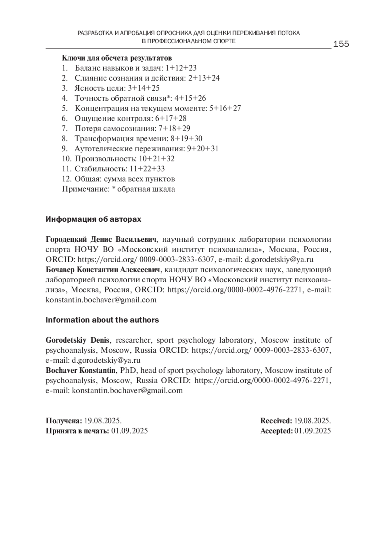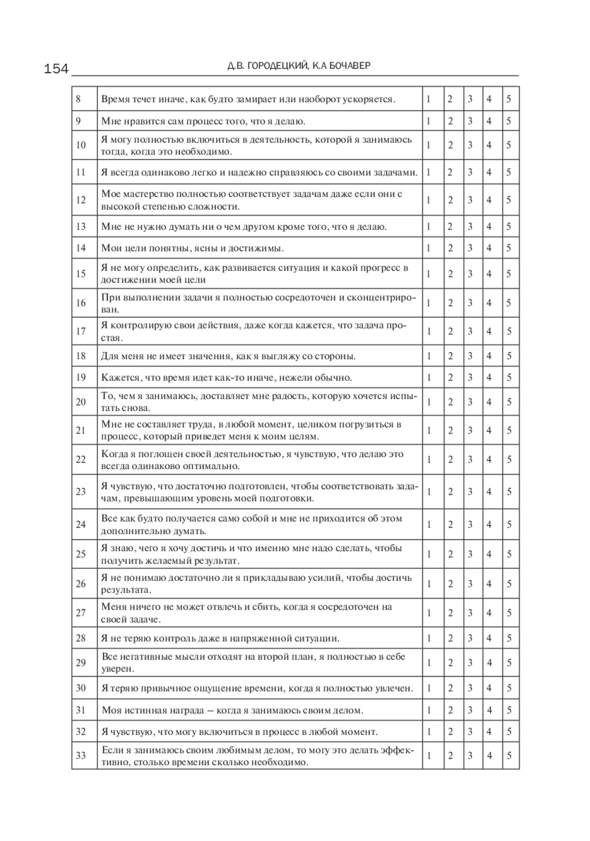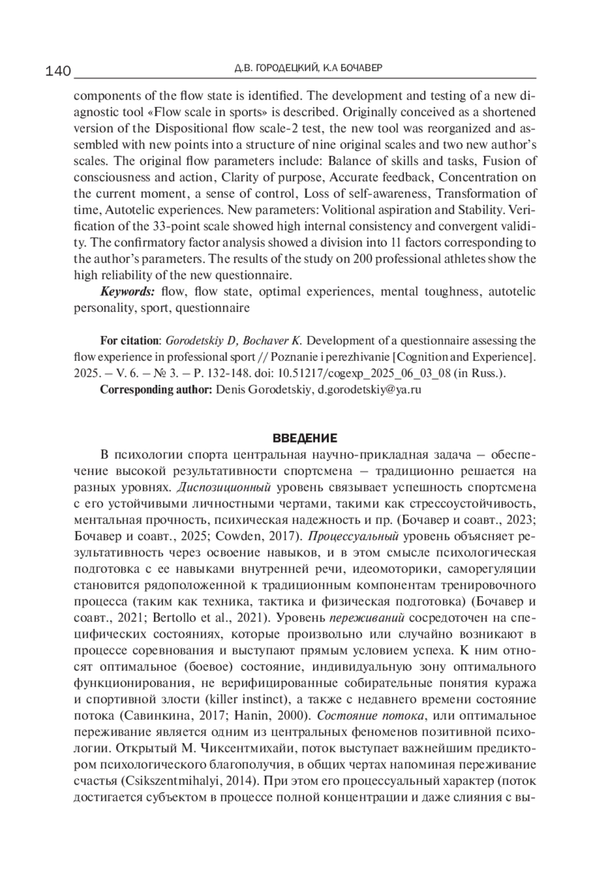 6. Квитчастый А.В. Бочавер К.А., Турова Е.А., Кукшина А.А., Ковалева А.В., Касаткин В.Н. Оптимальное переживание в спорте: валидизация русской версиидиспозиционной шкалы состояния потока // Актуальные проблемы психологического знания. 2017. №. 3. С. 33-44.