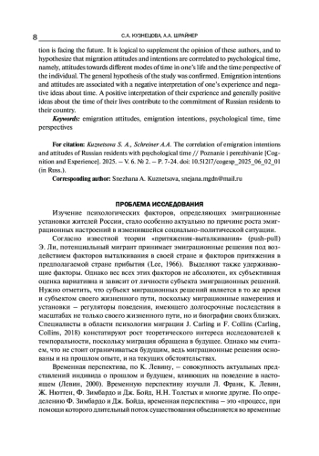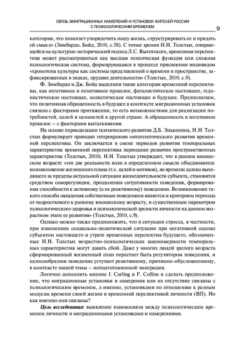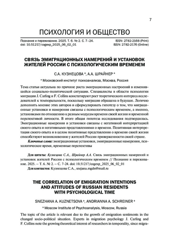 Тема статьи актуальна по причине роста эмиграционных настроений в изменившейся социально-политической ситуации. Специалисты в области психологии миграции J. Carling и F. Collins констатируют рост теоретического интереса исследователей к темпоральности, поскольку миграция обращена в будущее. Логично дополнить мнение этих авторов и сформулировать гипотезу о том, что миграционные установки и намерения связаны с психологическим временем, а именно, установками по отношению к разным модусам времени своей жизни и временной перспективой личности. В итоге общая гипотеза исследования подтвердилась. Эмиграционные намерения и установки связаны с негативной интерпретацией своего опыта и негативными представлениями о времени. Позитивная интерпретация своего опыта и в целом позитивные представления о времени своей жизни способствуют возникновению у жителей России приверженности своей стране.