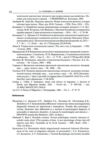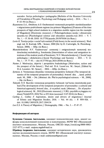 4. Кузнецова С.А., Орехова А.О. Особенности временных перспектив старшеклассников в миграционно подвижном регионе (на примере Магадана) [Электронный ресурс] // Психологическая наука и образование (psyedu.ru), 2015. - Т. 7. № 1. - С. 56-68. -. DOI: 10.17759/psyedu.2015070106
