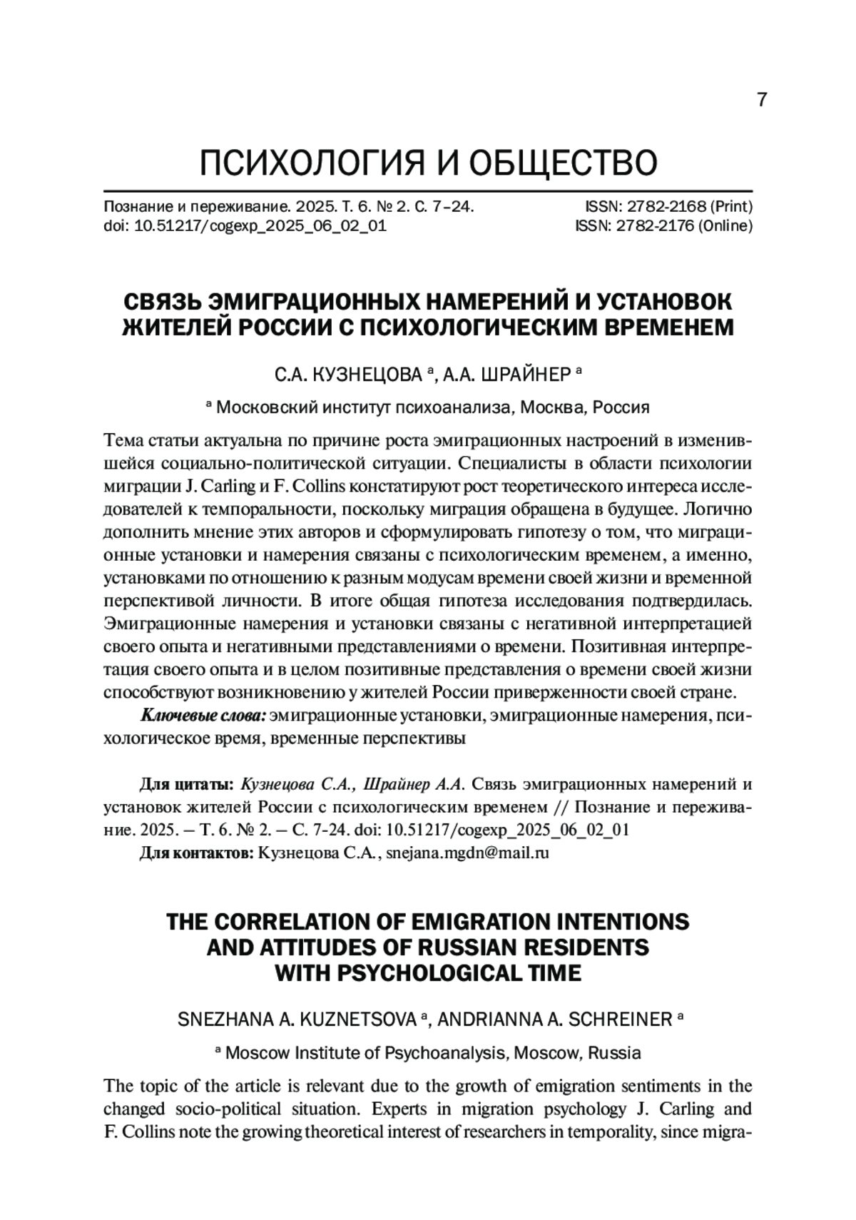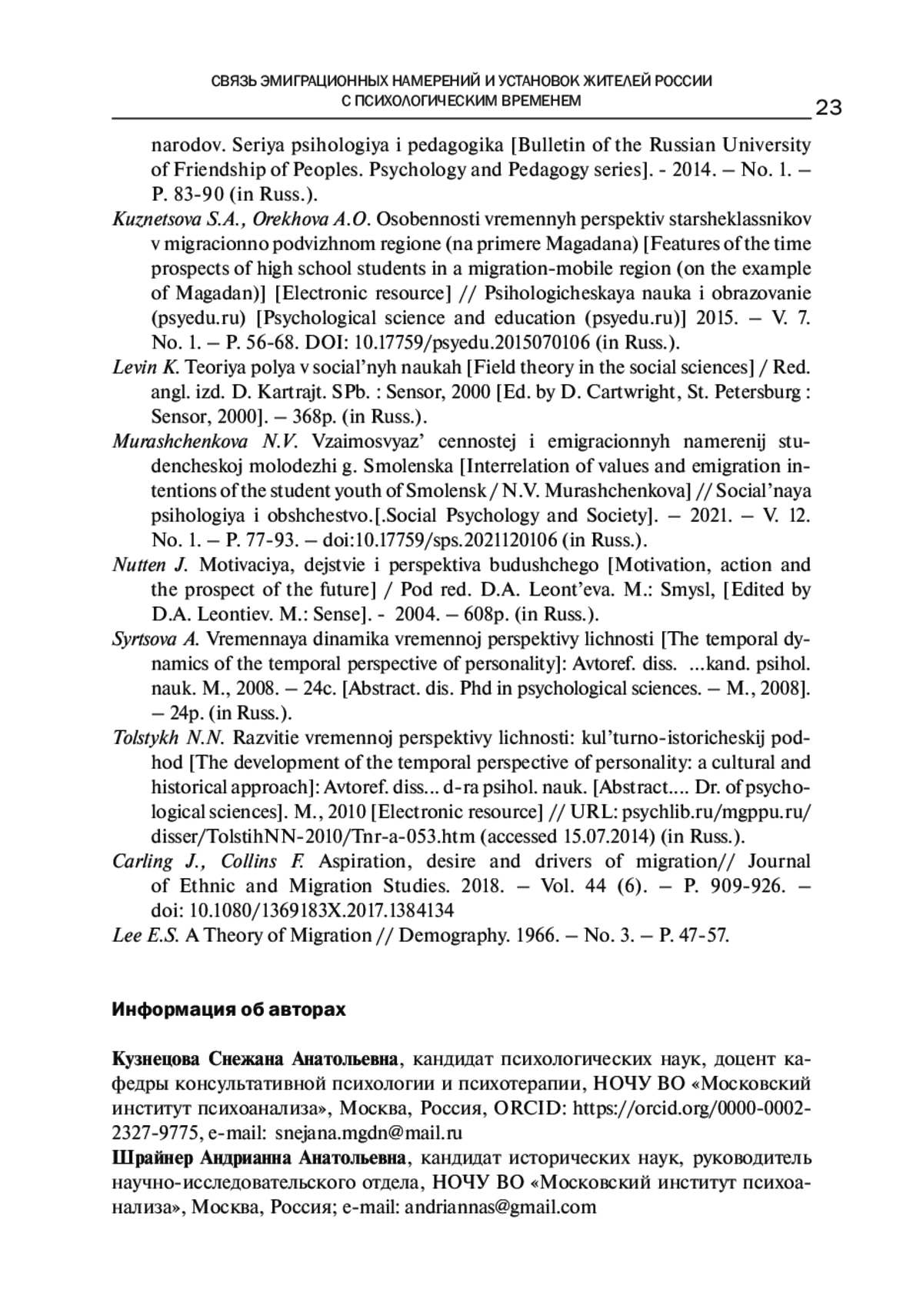 6. Муращенкова Н.В. Взаимосвязь ценностей и эмиграционных намерений студенческой молодежи г. Смоленска / Н. В. Муращенкова // Социальная психология и общество. - 2021. - Том 12. - № 1. - С. 77-93. -. DOI: 10.17759/sps.2021120106