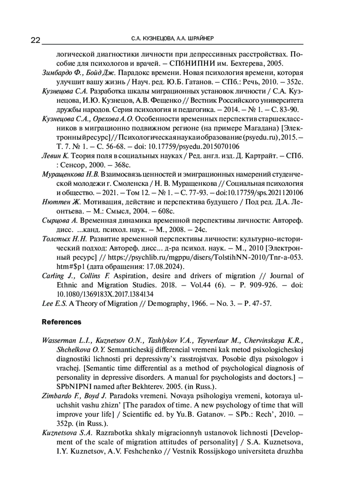 1. Вассерман Л.И., Кузнецов О.Н., Ташлыков В.А., Тейверлаур М., Червинская К.Р., Щелкова О.Ю. Семантический дифференциал времени как метод психологической диагностики личности при депрессивных расстройствах. Пособие для психологов и врачей. - СПбНИПНИ им. Бехтерева, 2005.