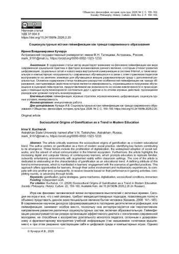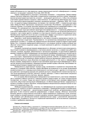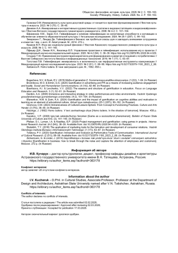 11. Толстова П.В. Геймификация: иммерсивность и включенность как перформативные инструменты коммуникации // Международный журнал исследований культуры. 2023. № 2 (51). С. 88-98. DOI: 10.52173/2079-1100_2023_2_88 EDN: STDVZZ