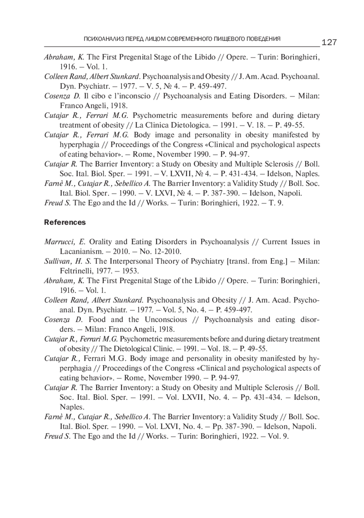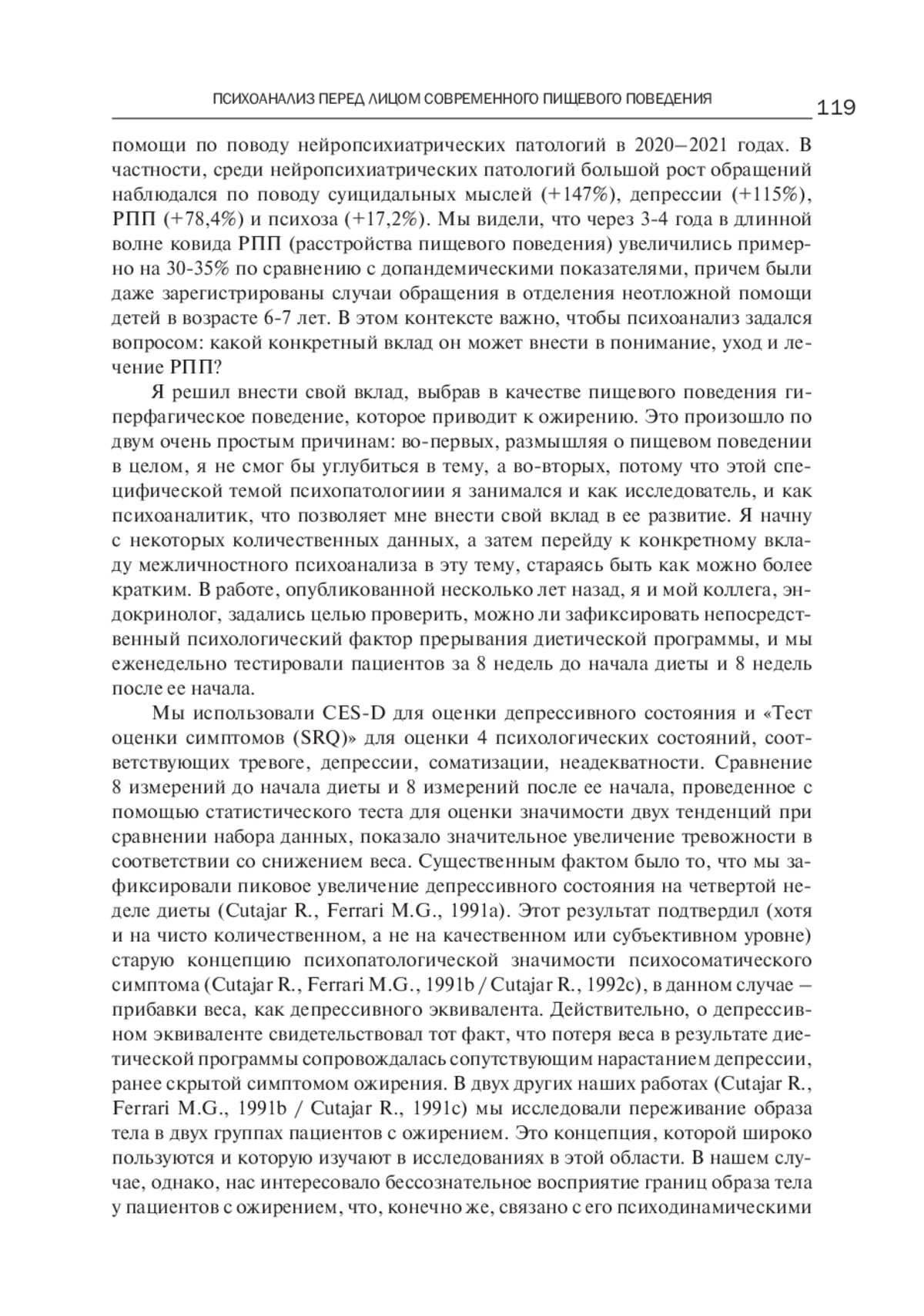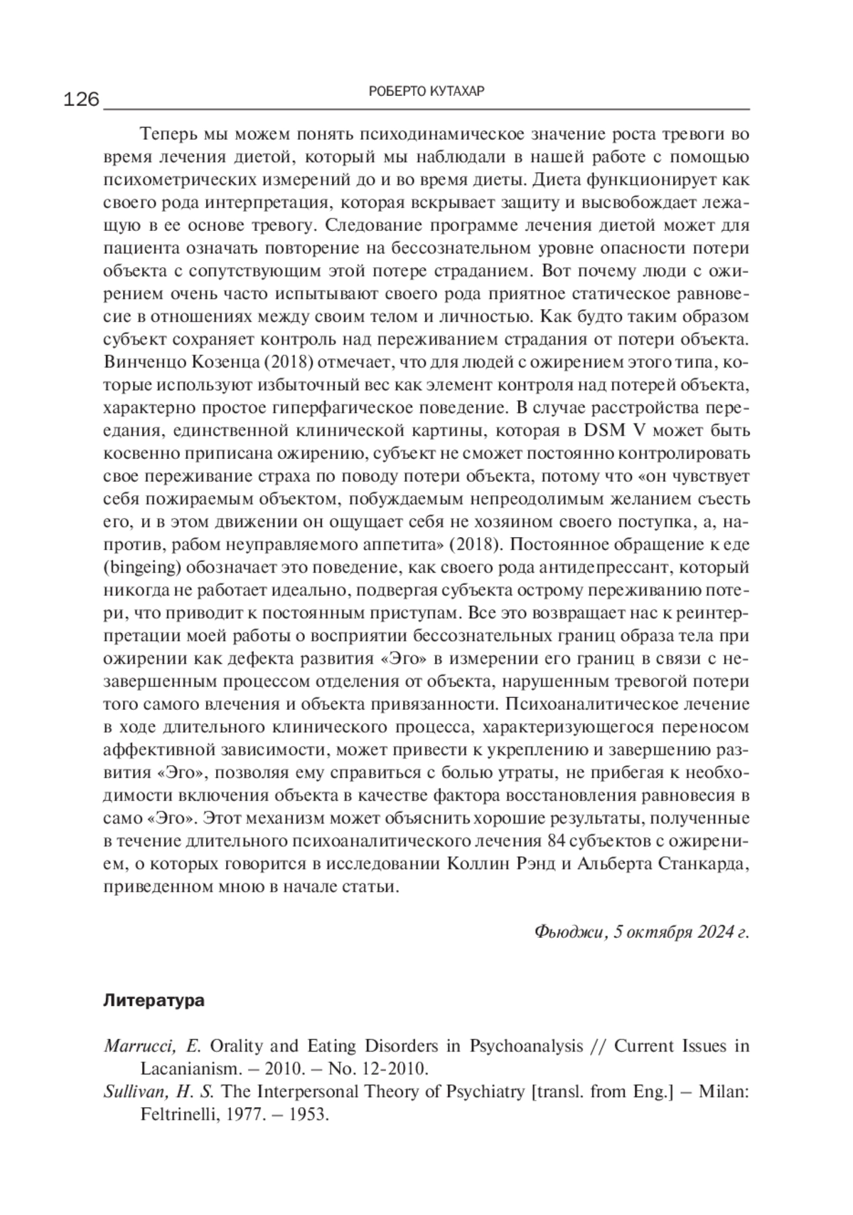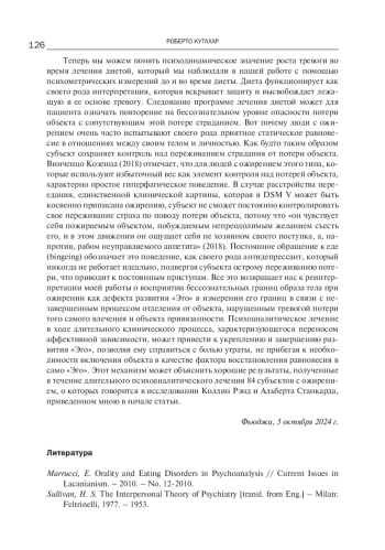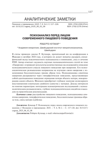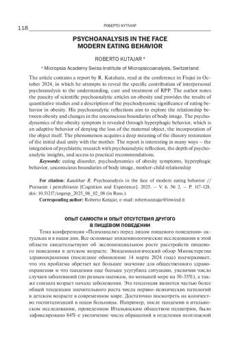В статье приведен доклад Р. Кутахара, прочитанный им на конференции в Фьюджи в октябре 2024 года, в котором он делает попытку раскрыть специфический вклад межличностного психоанализа в понимание, уход и лечение РПП. Автор отмечает скудность научных психоаналитических статей по теме «Ожирение» и приводит результаты количественных исследований и описание психодинамического смысла пищевого поведения при ожирении. Его психоаналитические размышления направлены на изучение связи ожирения с изменениями бессознательных границ образа тела. Психодинамика симптома ожирения раскрывается через гиперфагическое поведение, представляющее собой адаптационное поведение отрицания потери объекта матери, инкорпорацию самого объекта. Феномен приобретает глубокое значение иллюзорного восстановления изначально двойного единства с матерью. Доклад интересен по многим параметрам: интеграции психиатрических исследований с психоаналитическим размышлением, глубине психоаналитических инсайтов и выходом на практические рекомендации.