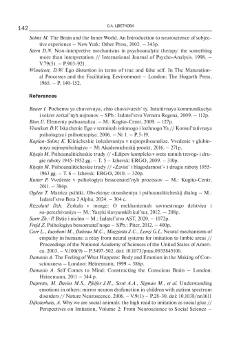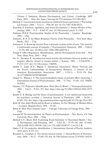 24. Gallese V., Eagle M.N., Migone P. Intentional Attunement: Mirror Neurons and the Neural Underpinnings of Interpersonal Relations // Journal of the American Psychoanalytic Association. 2007. - V.55(1). - P.131-176. DOI: 10.1177/00030651070550010601