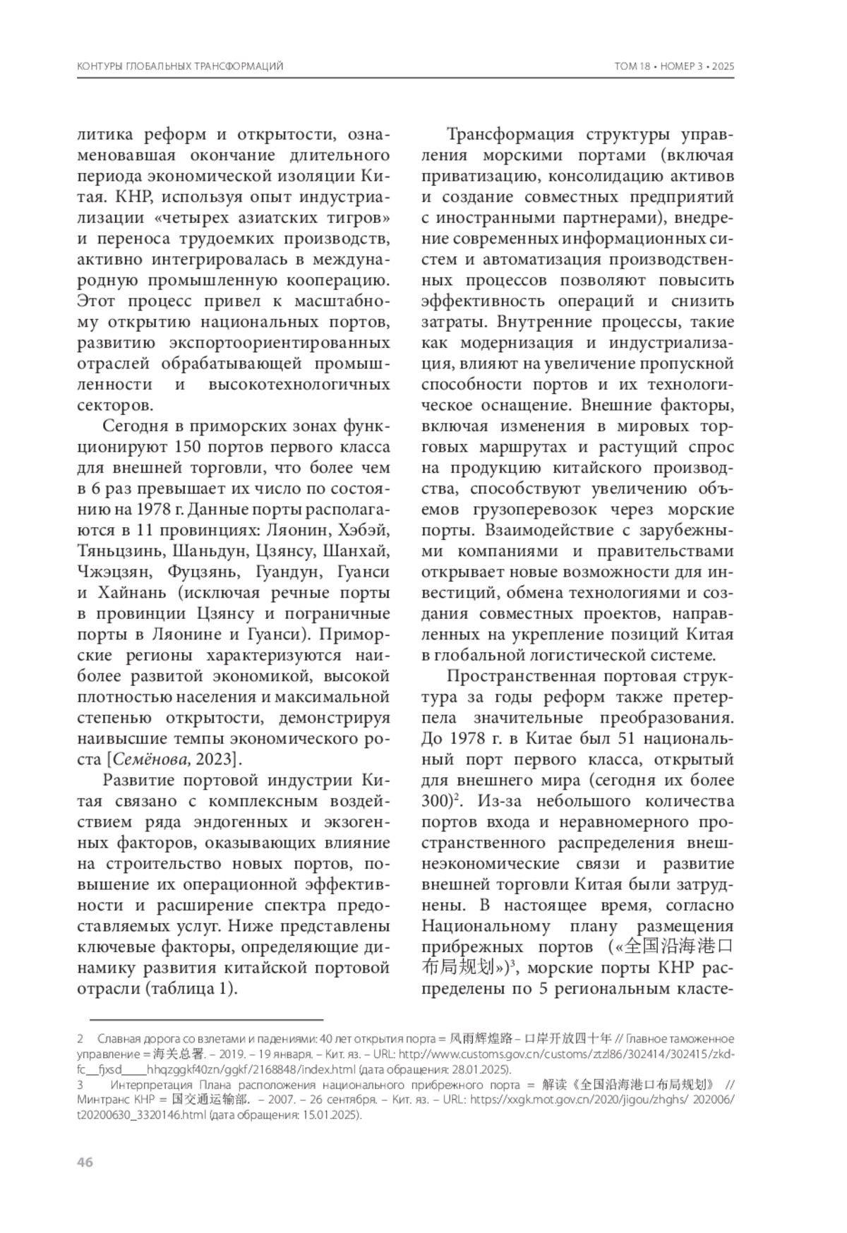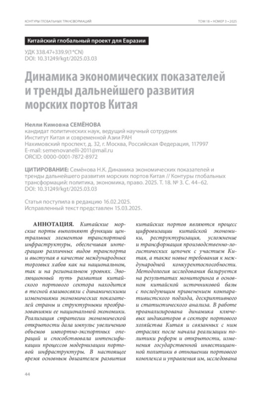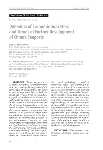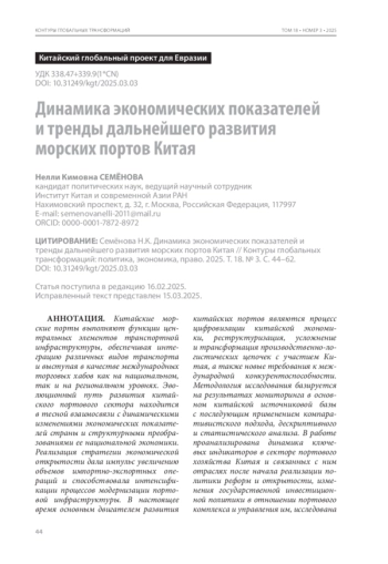 Китайские морские порты выполняют функции центральных элементов транспортной инфраструктуры, обеспечивая интеграцию различных видов транспорта и выступая в качестве международных торговых хабов как на национальном, так и на региональном уровнях. Эволюционный путь развития китайского портового сектора находится в тесной взаимосвязи с динамическими изменениями экономических показателей страны и структурными преобразованиями ее национальной экономики. Реализация стратегии экономической открытости дала импульс увеличению объемов импортно-экспортных операций и способствовала интенсификации процессов модернизации портовой инфраструктуры. В настоящее время основным двигателем развития китайских портов являются процесс цифровизации китайской экономики, реструктуризация, усложнение и трансформация производственно-логистических цепочек с участием Китая, а также новые требования к международной конкурентоспособности. Методология исследования базируется на результатах мониторинга в основном китайской источниковой базы с последующим применением компаративистского подхода, дескриптивного и статистического анализа. В работе проанализирована динамика ключевых индикаторов в секторе портового хозяйства Китая и связанных с ним отраслях после начала реализации политики реформ и открытости, изменения государственной инвестиционной политики в отношении портового комплекса и управления им, исследована современная структура портовой отрасли Китая, формирующая агломерационный эффект за счет оптимизации размещения производственных мощностей и адаптации промышленной структуры к потребностям ведущих секторов китайской экономики, а также сформулированы ключевые тренды в развитии морских портов Китая.